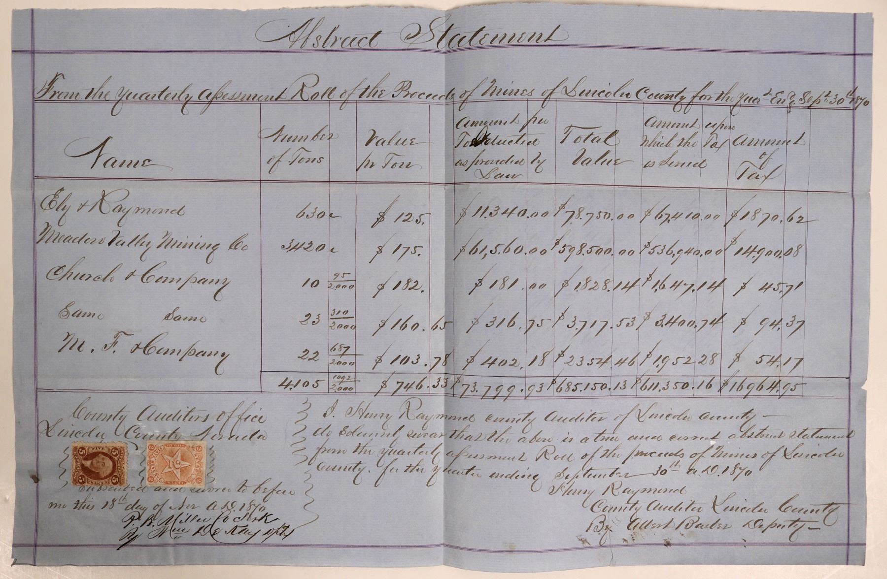 29 line entries of producing mines in Lincoln County, mostly at Pioche. Gross yield for the quarter was about $513,000. The largest producers were Raymond & Ely $188,718; Meadow Valley MC $180,755; Newark MC $38,328. One very interesting thing on this form is the seperation of tails and ores milled. This shows a concerted effort at mining or priocessing tailings that contained significant values missed in the first round of milling.