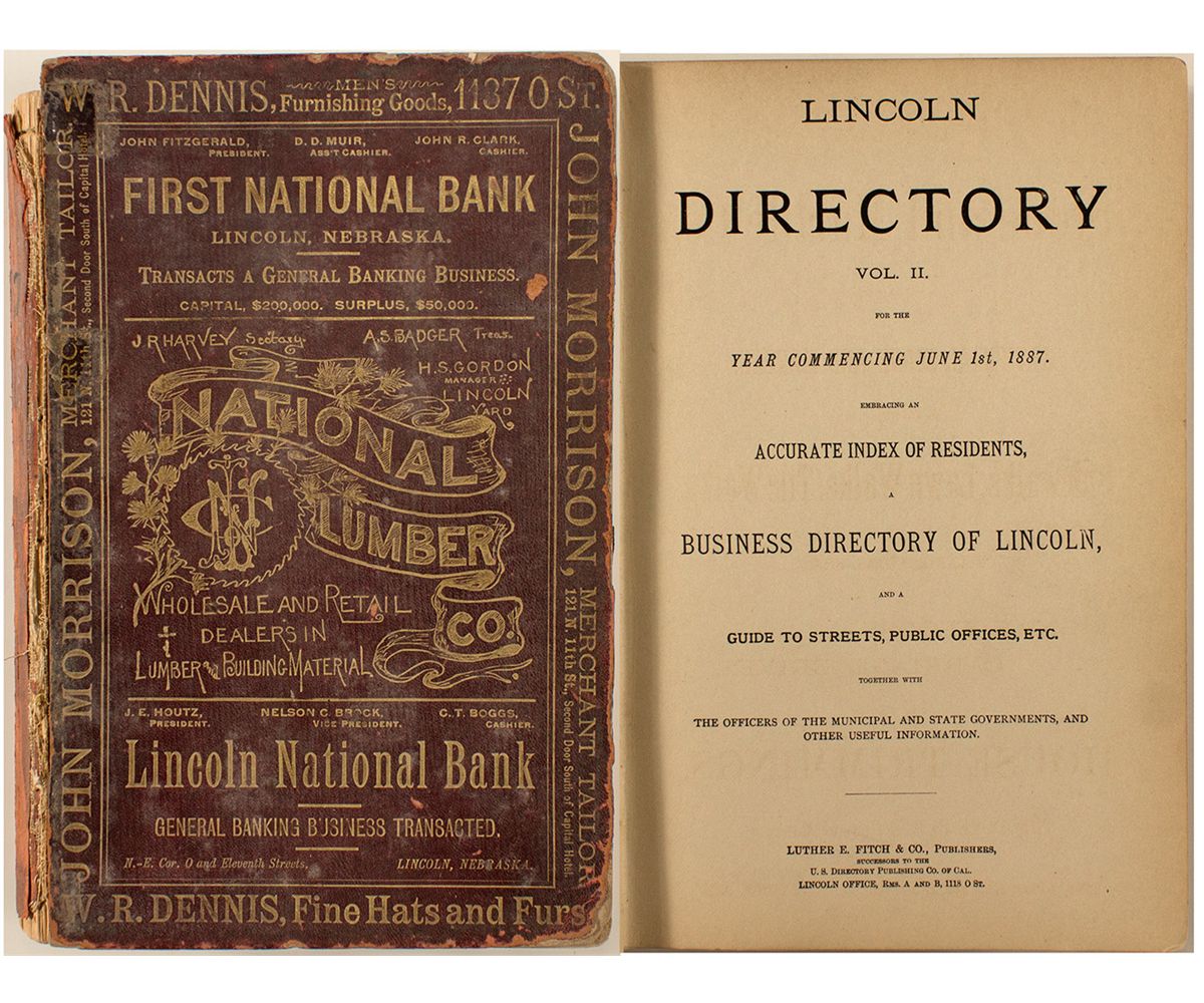 Volume II. Compiled by Luther E. Fitch & Co. Residential and business directory. Advertisements on covers and throughout book. Lists officers of the court and state governments, public school and university employees, societies and banks, etc. Includes Table of Contents and an Alphabetical list of advertisers. Front and back covers unhinged. Spine may not be original. 364 pages. [Rarity: i]City: LincolnCounty: State: NEDate: 1887