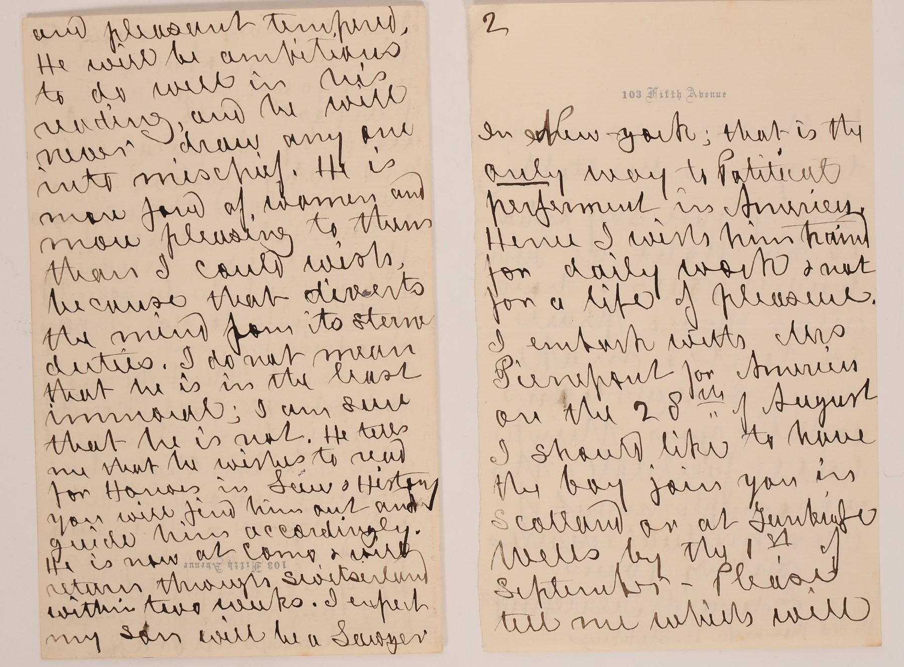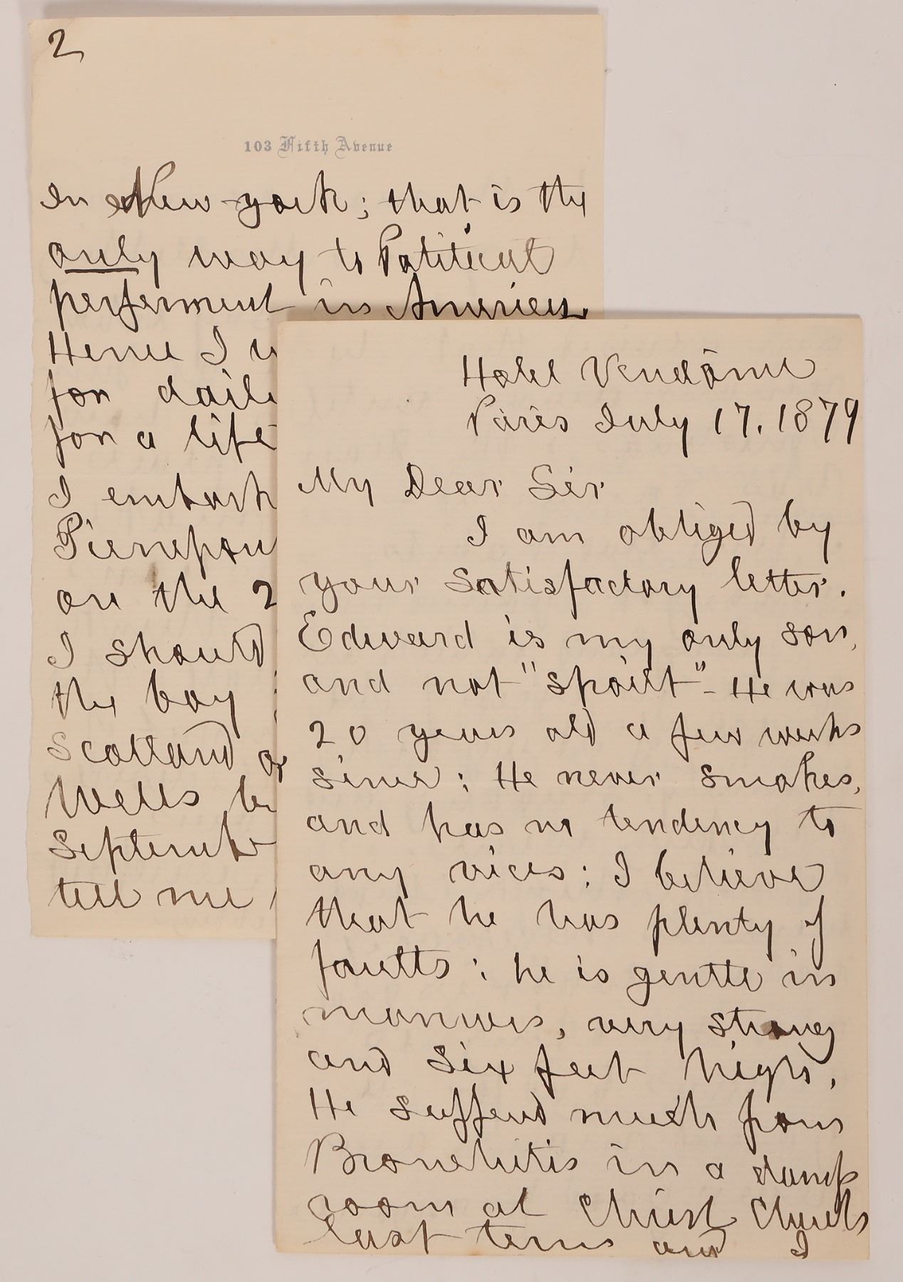 Edwards Pierrepont (1817-1892) served as Abraham Lincoln's personal advisor before and after Lincoln was elected president. He was appointed by Abraham Lincoln to try the cases of those who had been imprisoned in the North for suspected disloyalty to the Union cause. In 1867 he was chosen to prosecute John Suratt, one of the assassination conspirators. President Grant appointed him attorney general (1875), and later minister to Great Britain. Offered here is a six page handwritten letter ( 4 1/2 x 7 inches), written from the Hotel Vendome, Paris, July 17, 1879 to Rev. Thomas R. R. Stebbing (1835-1926) the naturalist and theological writer. The letter concerns his son Edward moving to England where he will encounter the young mens habits of "smoking and drinking wine."