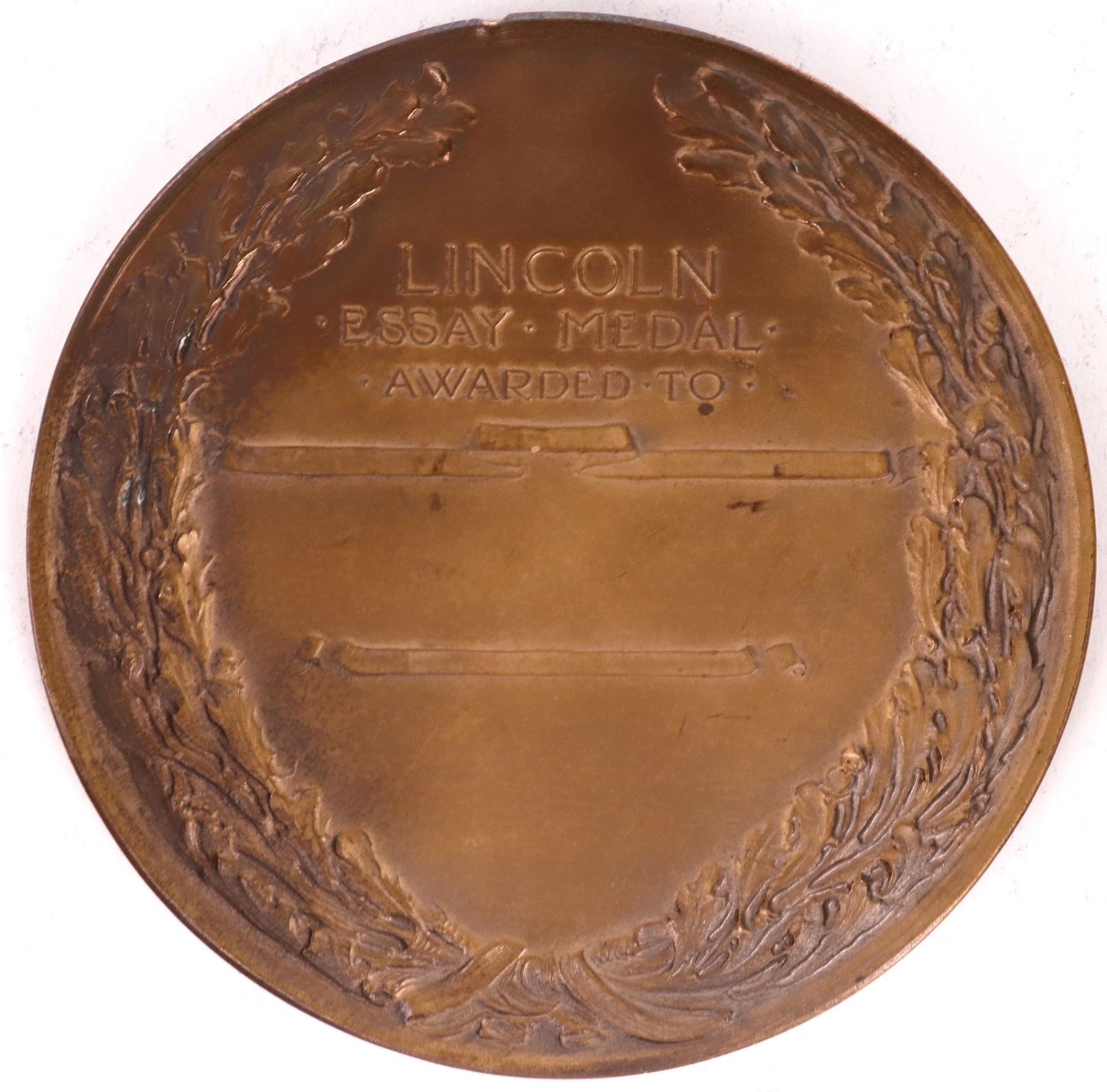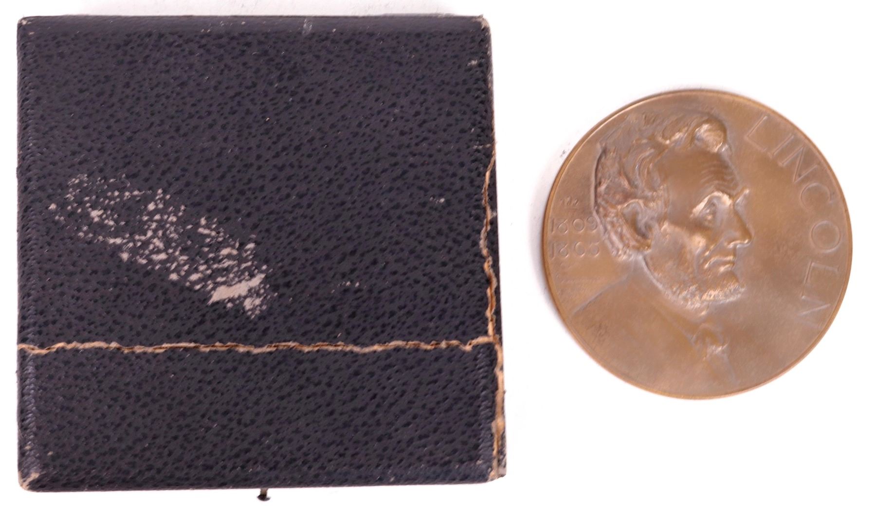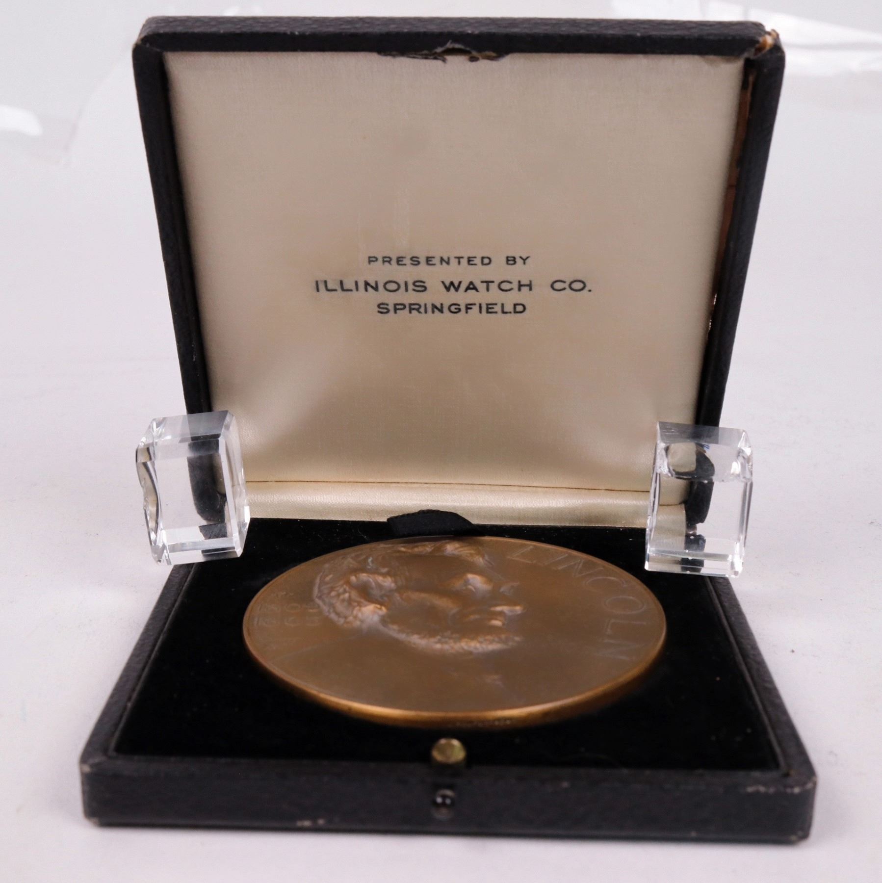 Whitehead-Hoag bronze Lincoln essay medal in original case presented by Illinois Watch Company, Springfield. Sculpted by Charles Hinton, 75 mm. Hinton studied at the Cooper Union and the National Academy; won a scholarship to study in Paris under Jean-Leon Gerome at the Ecole des Beaux-Arts. Returning the United States in 1901, Hinton began teaching at the National Academy, became dean in 1938, a position he held until 1948. He is best known for his designs on medals honoring Charles Lindbergh and Abraham Lincoln.
