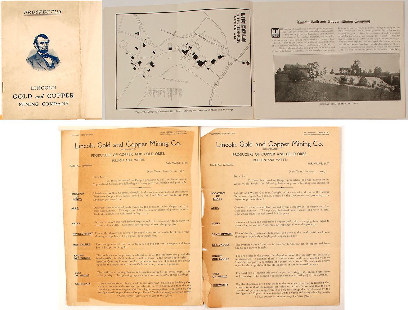 Lot of three. 1) 18 page prospectus. Drawing of Lincoln on front cover. Two full page maps. Twelve photographs. 7.25 x 9.25". Folded vertically. 2-3) Two letter size two page letters about the Lincoln Gold Mining Company. "Ore bodies are practically inexhaustible." (Al Adams Gold Rush Memorabilia Collection) Date: 1907 Location: Metasville, Georgia HWAC# 57054