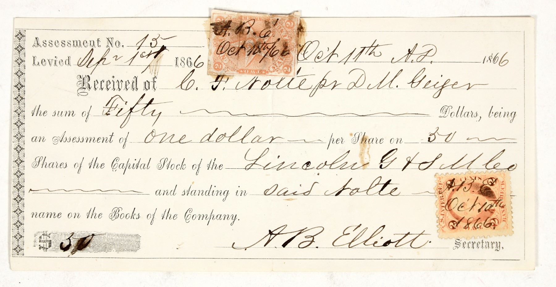 Rare. 1866 assessment receipt for CF Nolte on behalf of DM Geiger for $50 on 50 shares of stock. Signed by secretary AB Elliott. Orange NV adhesive stamp and US IR stamps. Likely issued in Virginia City. 3.5 x 7" The Lincoln owned mining property on Cedar Hill. DM Geiger is the namesake of Geiger Grade, one of the roads into Virginia City from Washoe County. AB Elliott was a lawyer in VC and elected to Nevada Assembly in 1866.