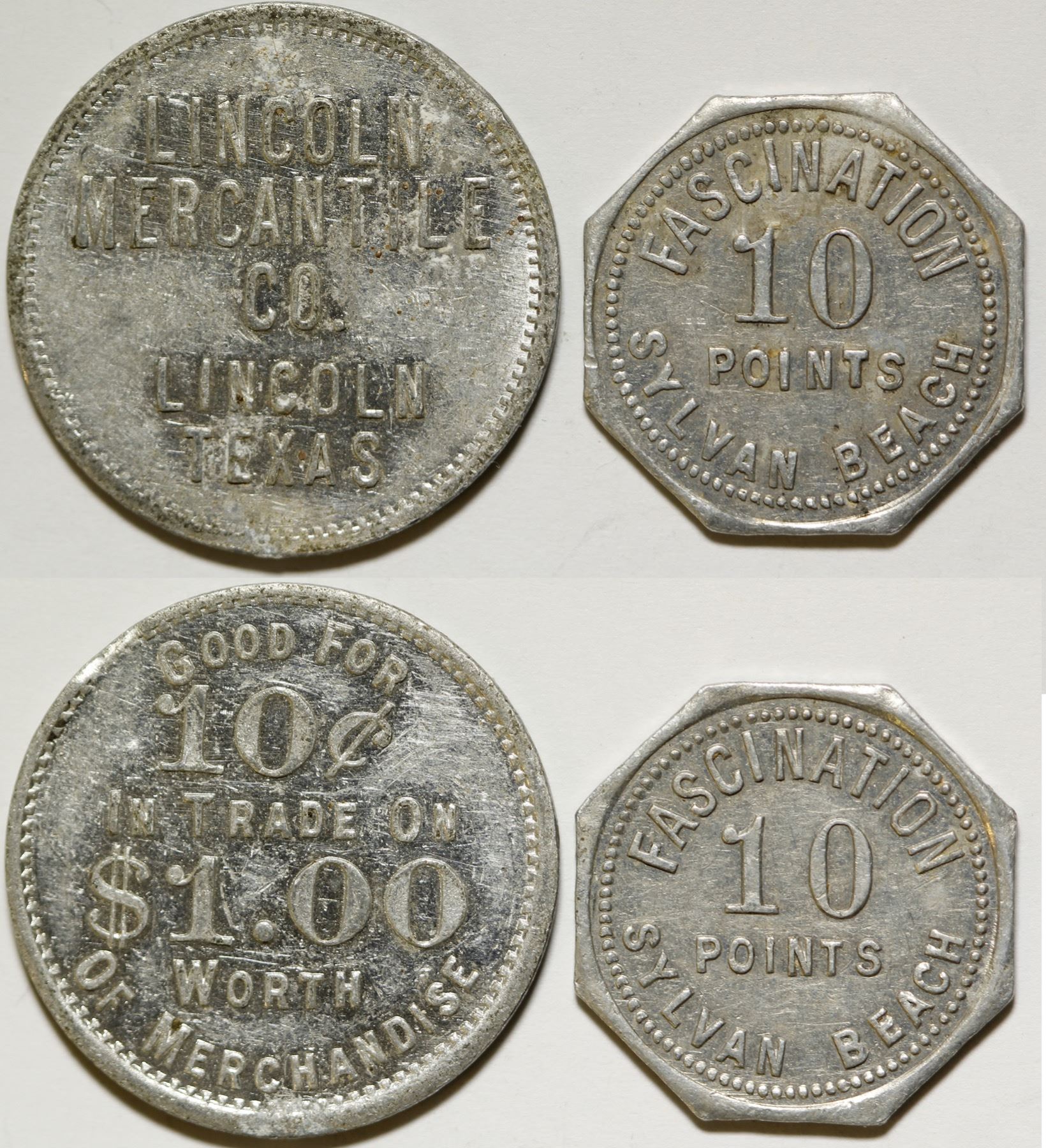 Obv.: Lincoln / Mercantile/ Co. / Lincoln / Texas; Rev.: Good For / 10c / In Trade On / $1.00 / Worth / Of Merchandise. Al., rd., 27 mm. Bonus: Octagonal aluminum, 10 points at Fascination from the Slyvan Beach Amusement Park in La Porte. State: Texas City: Lincoln Date: HWAC# 81465