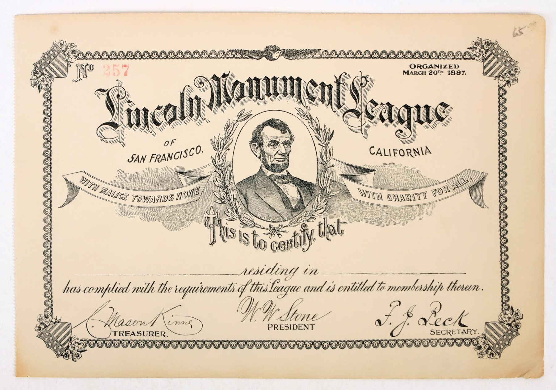 Unissued certificate number 257 from the Lincoln Monument League of San Francisco, California. Signed by W. W. Stone, President and F. J. Peck, Secretary. 9 x 6 inches; vignette of Abraham Lincoln. The "Lincoln Monument League of San Francisco, California" was a group that funded the erection of an Abraham Lincoln statue in Civic Center Plaza, originally dedicated in 1927, to replace a previous one destroyed in the 1906 earthquake.
