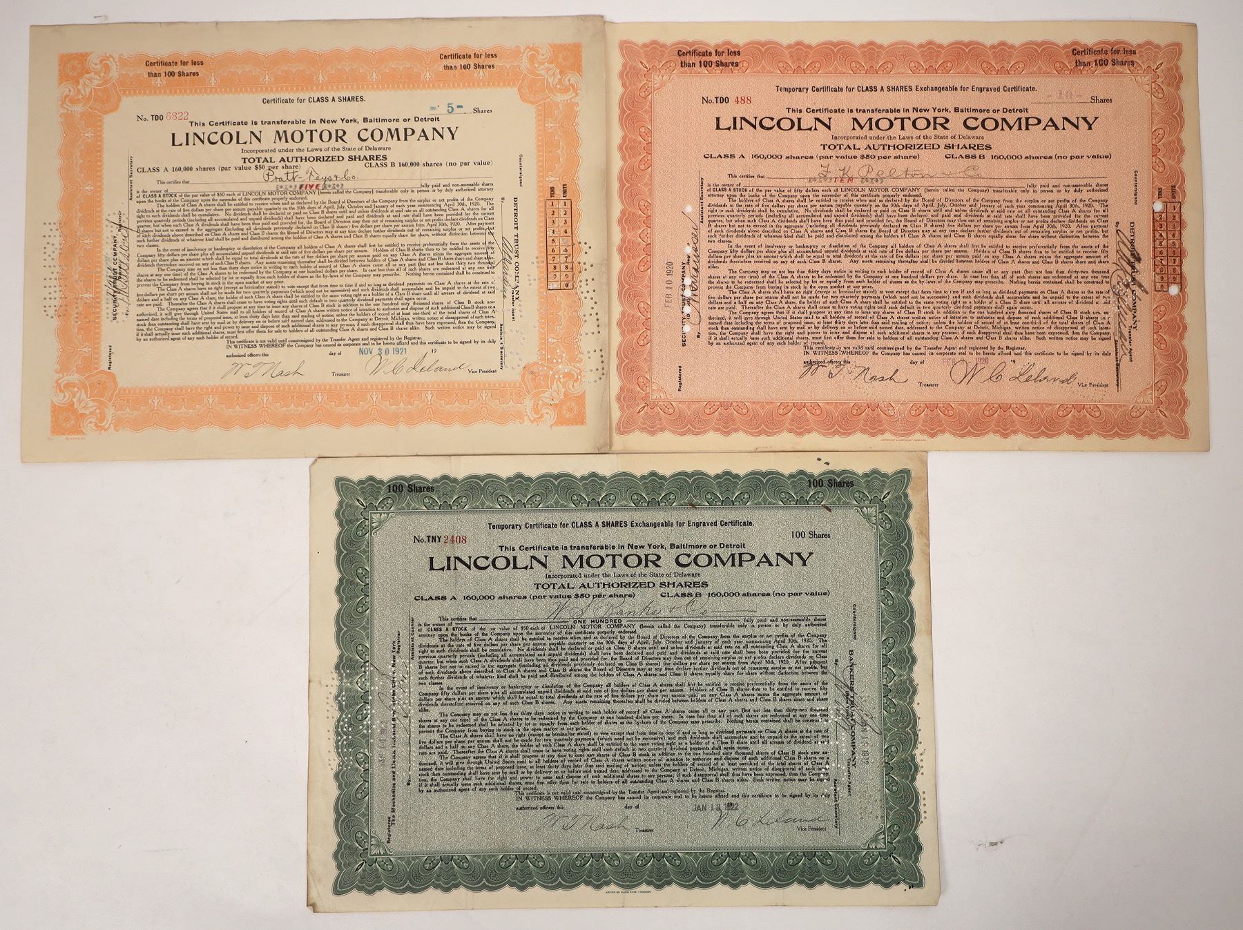 3 different 1920-22 Lincoln Motor stocks, signed by Leland. 1920 rust has small verso tape on crease tears.
