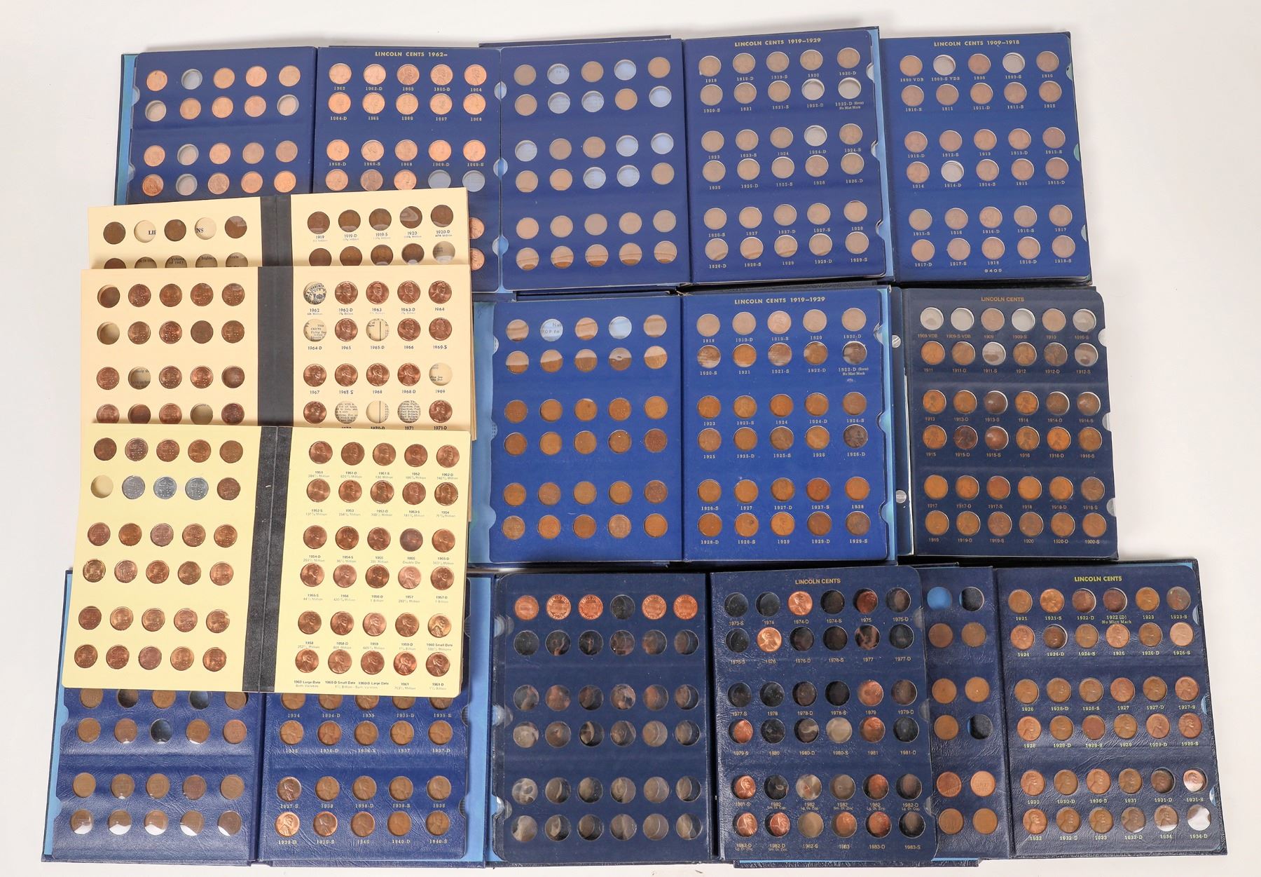 Lot of eleven coin albums of Lincoln cents. 1) Library of Coins Vol.2 Lincoln Cents Part 1 1909-1940 with 68 coins, missing 17 including all the rare dates. 2) Library of Coins Vol.3 Lincoln Cents Part 2 1941- with 69 mostly BU cents, missing 1944, 1955 double die, 1968. Album has dates until 1972. 3) Library of Coins Vol. 3 Lincoln Cents Part 2 1941- with 55 coins, many BU. Album has dates through 1976. 4) Whitman #9112 Lincoln Cents 1909- with 18 coins, none older than 1959. 5) Whitman #9406 Lincoln Cents 1941- with 77 coins, many BU, latest date 1974. 6) Whitman #9405 Lincoln Cents 1909-1940 with 86 coins, mostly F-EF, missing key dates but does include a 1931-S. 7) Whitman #9405 with 86 coins, has a 1914-D and a 1931-S. 8) Whitman #9405 with 66 coins, VG-EF, missing key dates. 9) Whitman #9405 with 76 coins, missing key dates. 10) Whitman Classic #9112 with 155 coins 1909-1977, missing many key dates, later coins BU. 11) Whitman Classic #9112 with 191 coins through 1995, missing key dates and some later dates as well.VG-AU condition.