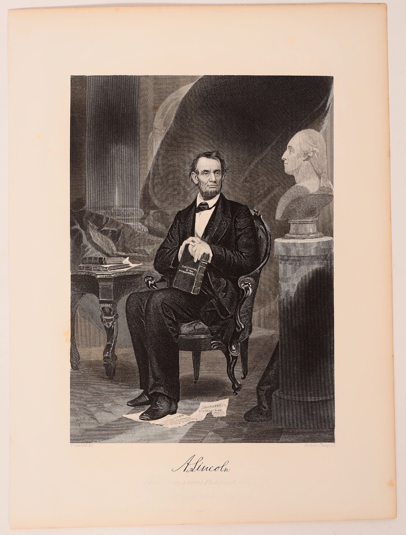 Painted by Alonzo Chapel (1828-1887) from a likeness from a recent photograph. Bears an engraved signature "A. Lincoln". Published by Johnson, Fry & Co, of New York. 8 x 11 inches, suitable for framing. [