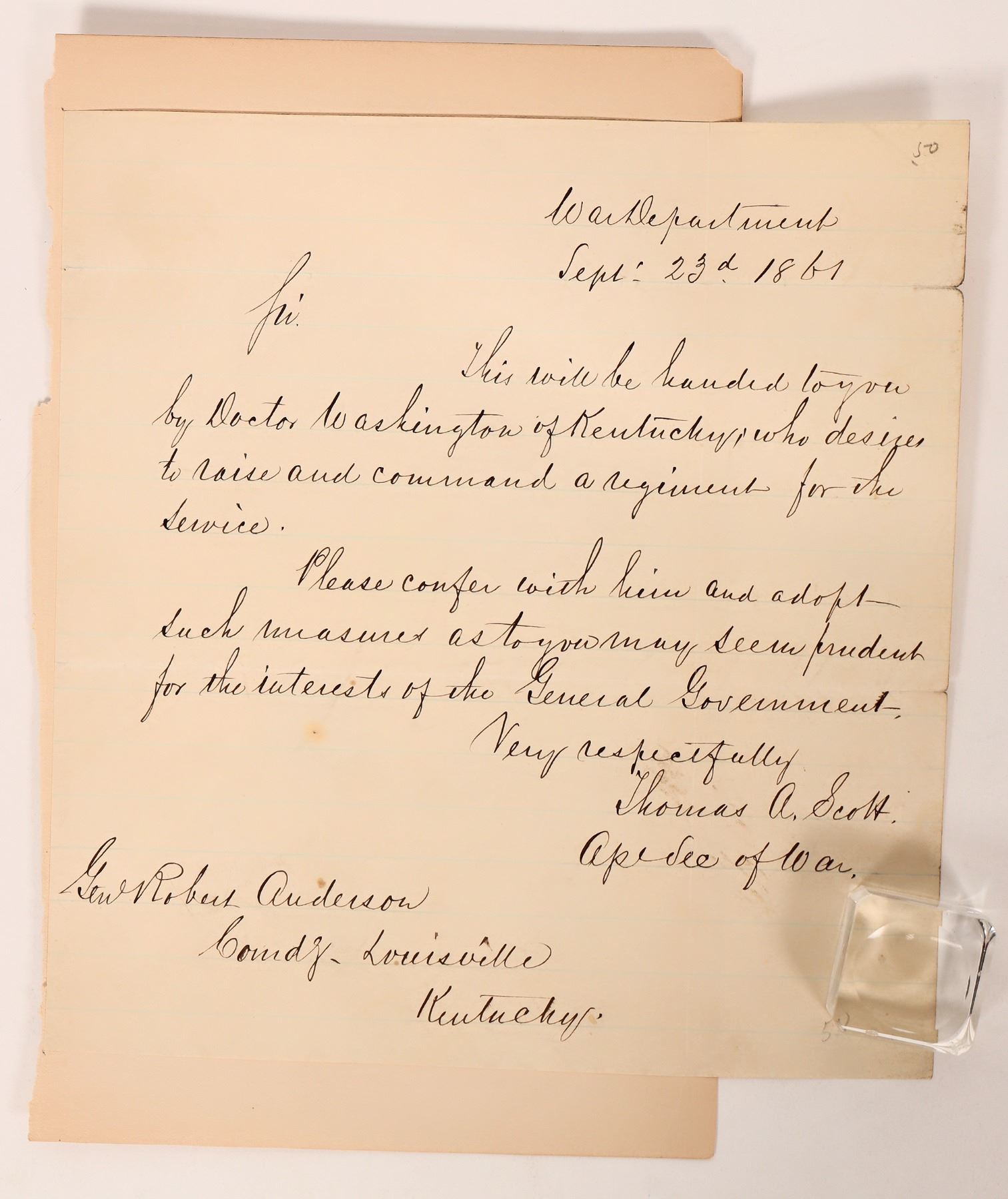 Thomas A. Scott (1824-1881) was Lincoln's Assistant Secretary of War. He later became a railroad baron. This handwritten letter dated September 23, 1861 to General Robert Anderson, Commander, Louisville, Kentucky. Introduces Doctor Washington of Kentucky. 7 x 9 inch paper with minor wear; left margin attached to a sheet of paper.