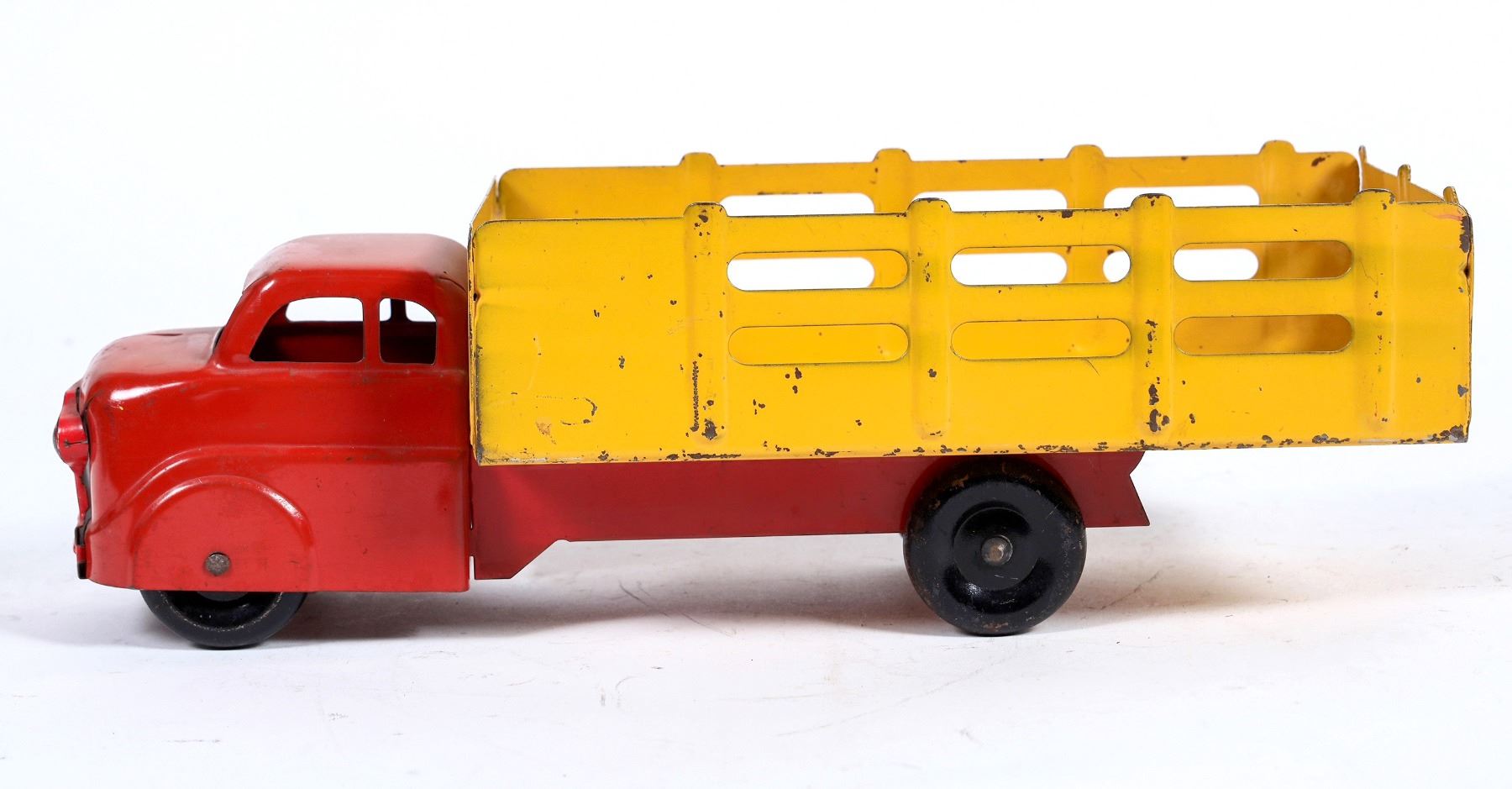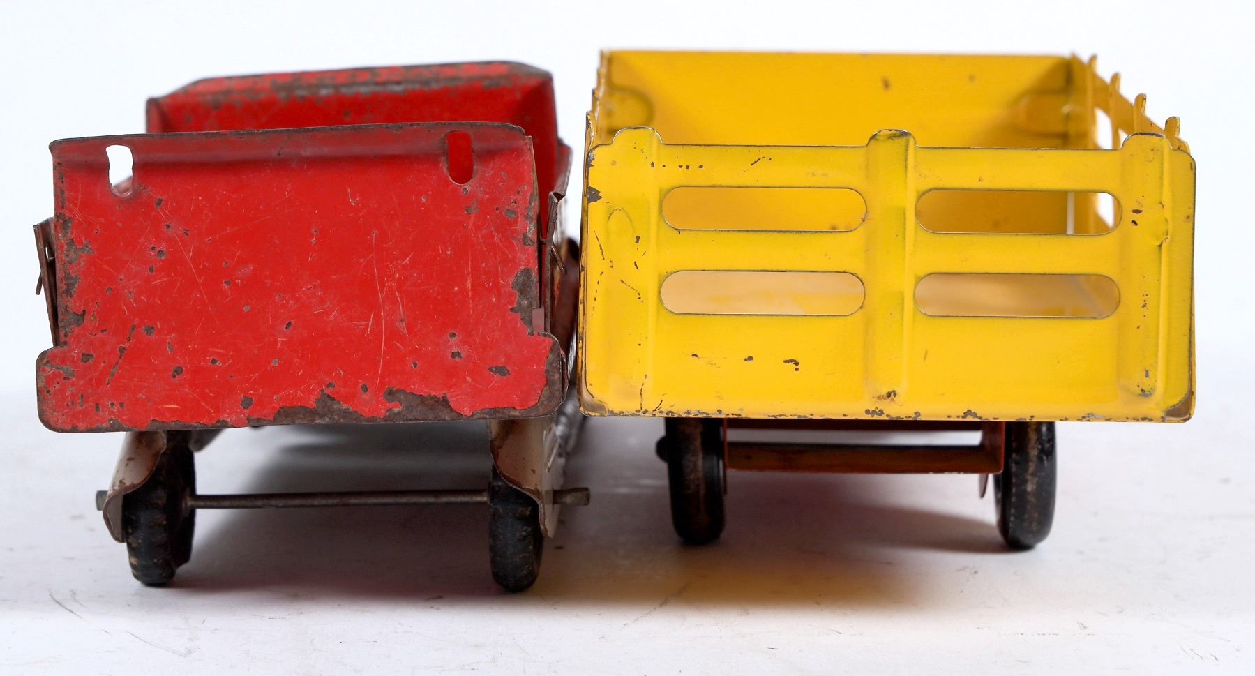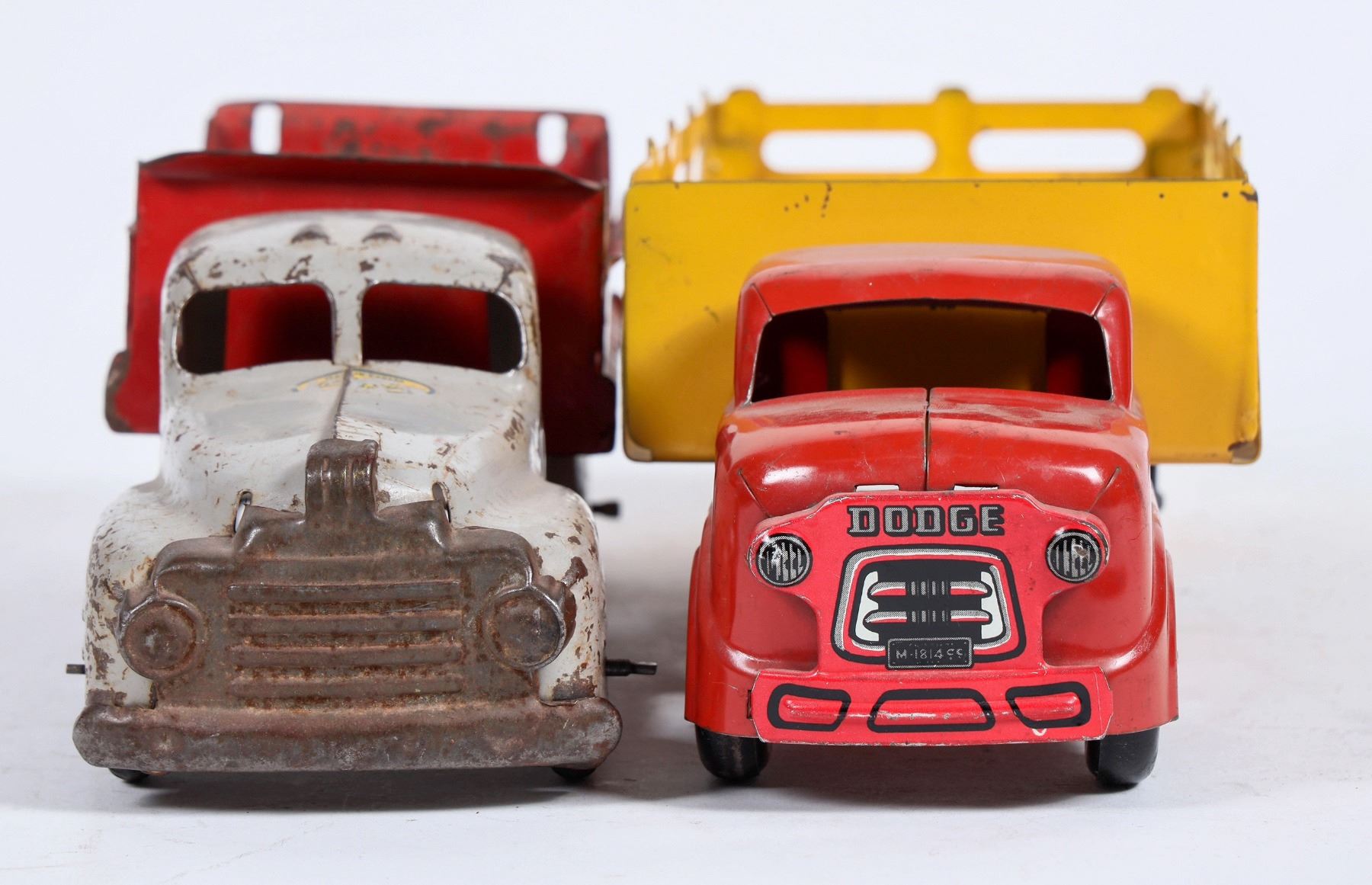 The red and yellow "Dodge" delivery truck appears to be complete. The truck bed does not turn independently of the truck-head or have a dump mechanic. Truck measures approximately 12"x4.5"x3.75" overall. Both trucks have light playwear.