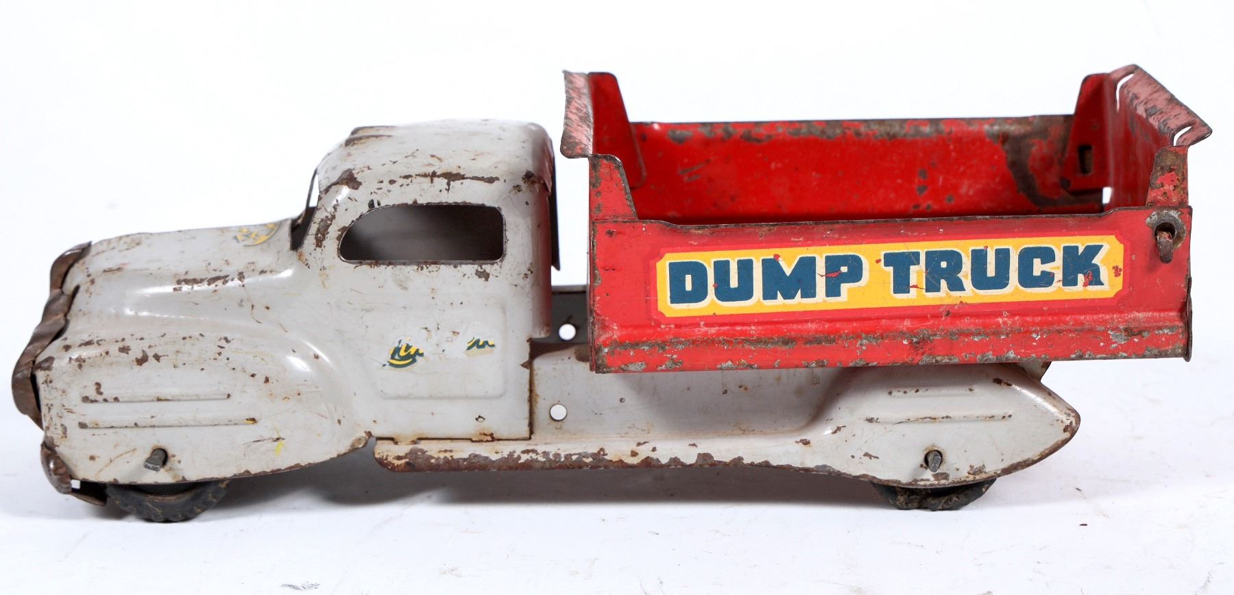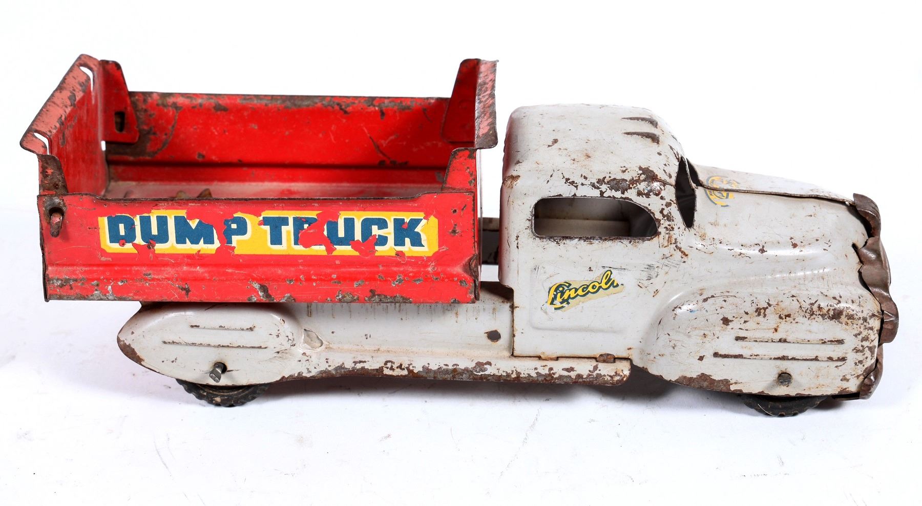Lincoln Toys dump truck in eggshell white and bold red. "Dump Truck" is painted on the side of the functioning dump-truck bed in blue and yellow. The dump lever is missing on this truck, though the mechanic works smoothly when tilted. Dump truck measures approximately 11"x2.5"x3" overall.