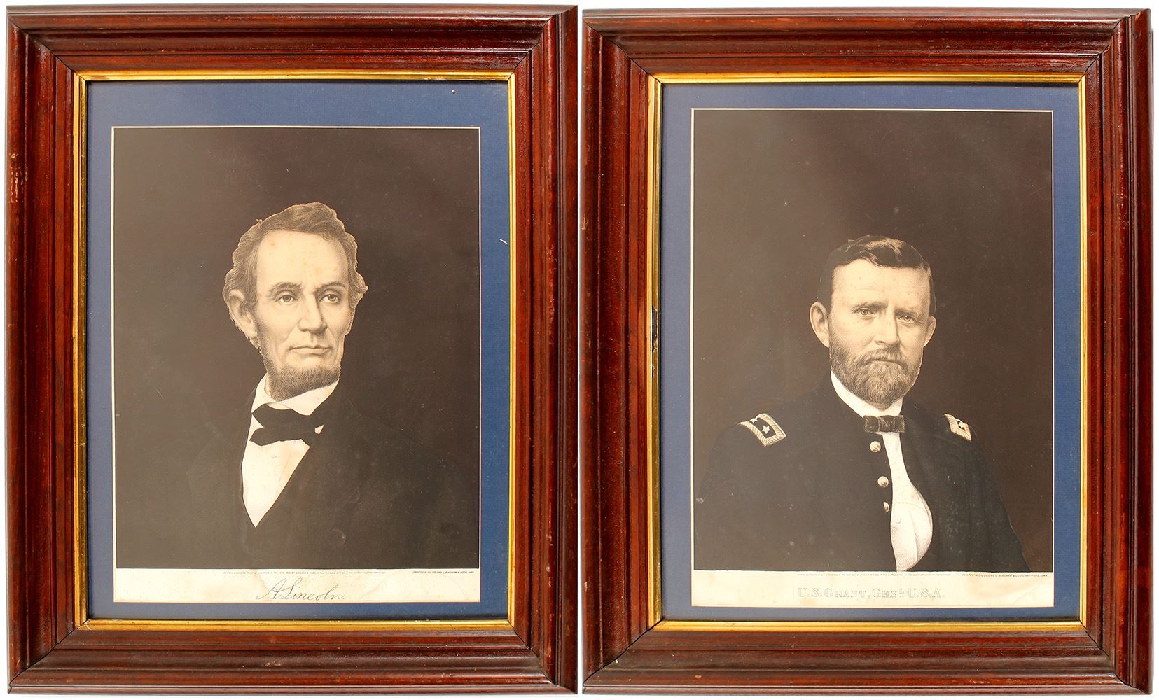 Two large framed lithographs prints of Lincoln and Grant by Bingham & Dodd, Connecticut, printed from "oil colors, by Bingham & Dodd, Hart." overall framed size 20 x 24", old glass. Lincoln print has water damage to print along bottom printed margin, some foxing on shirt, otherwise colors sharp. The Grant litho has foxing throughout, as seen in the photograph, as well as minor water damage at lower right of margin. The frames and mats are matching. When these pieces came to us, they were covered in nicotine, now completely removed. The Bingham Dodd lithos are of high quality, and don't show up often for sale. Date: Location: HWAC# 56442