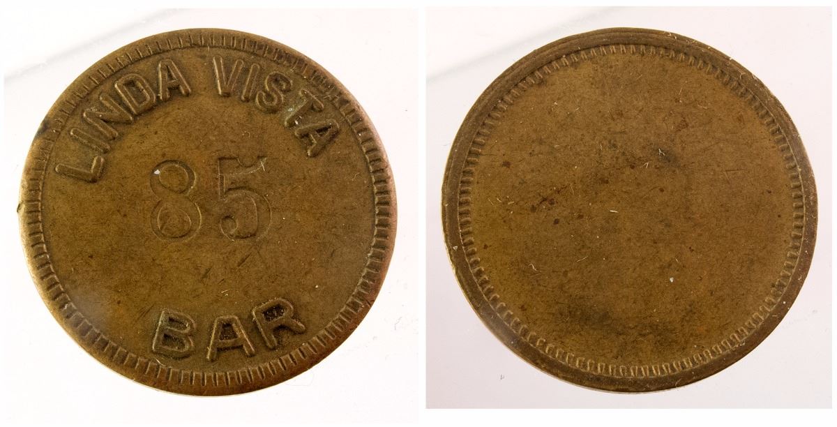 Linda Vista Bar, blank reverse. Brass, round. Rare California town. State: California City: Linda Vista Date: FHWAC#: 43573