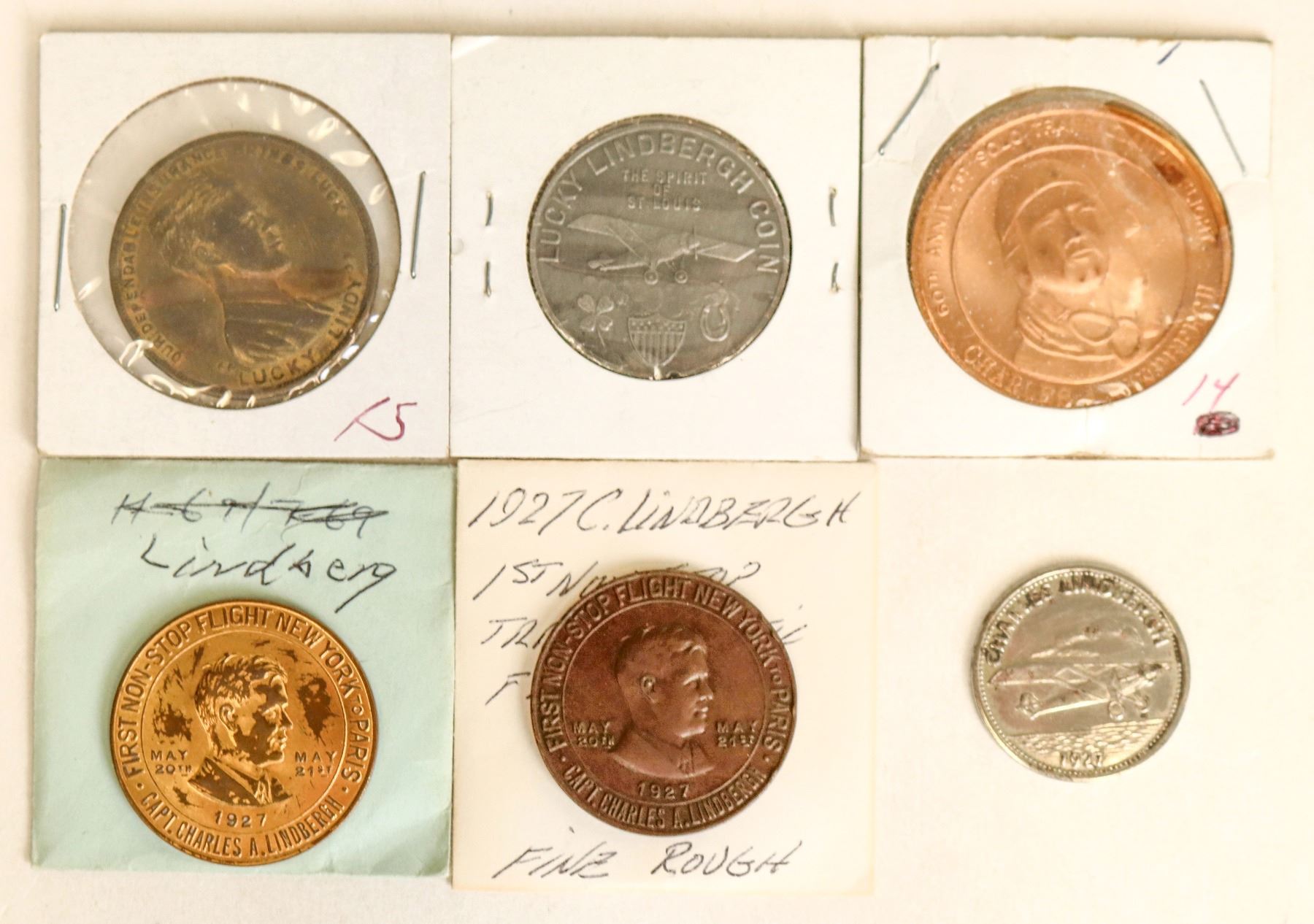 Lot of six medals celebrating Charles Lindbergh & the Spirit of St. Louis: 60th anniversary medal in copper; Lucky Lindbergh coin, white metal; Shell Oil Lindbergh, white metal; Lucky Lindbergh coin in copper; Michigan Mutual Liability Company, bronze; Lucky Lindbergh coin brass. [St. Louis Missouri