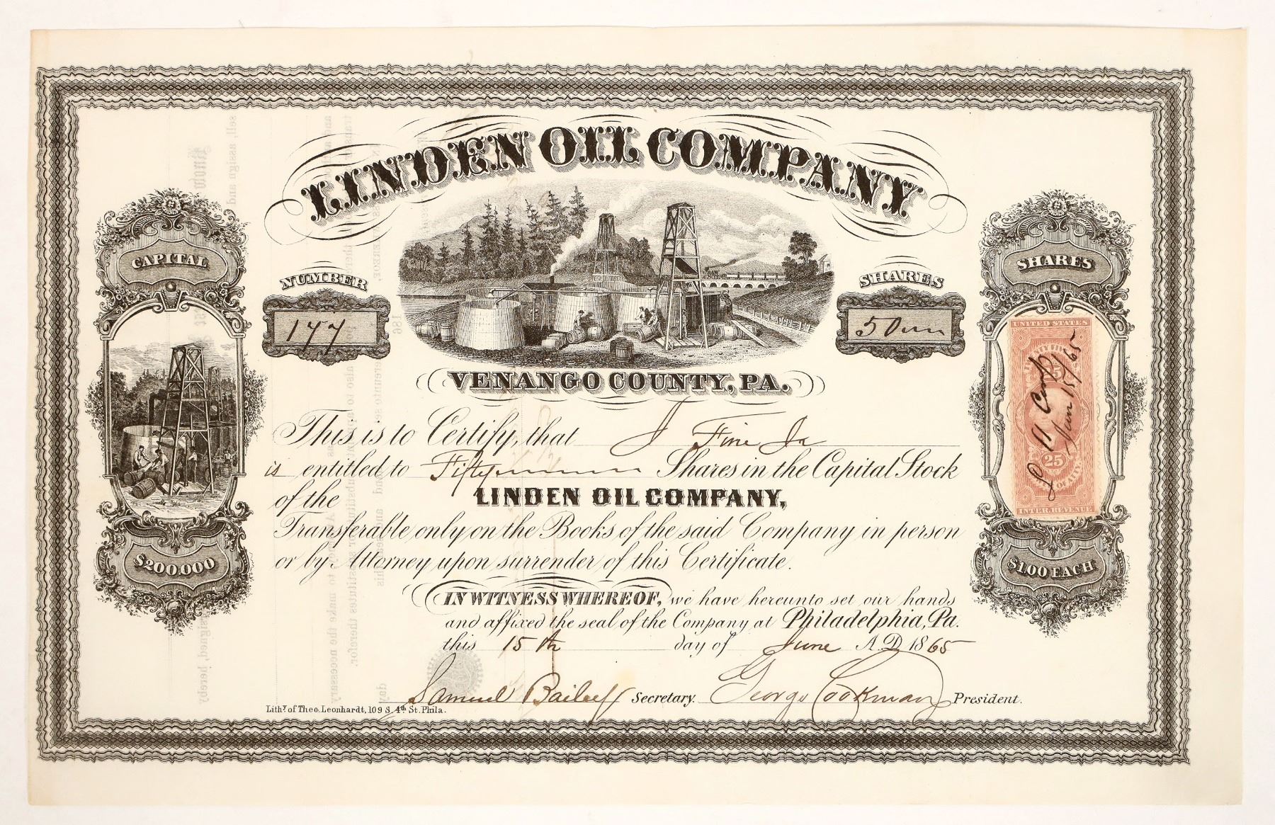 A stock certificate for 50 shares in the Linden Oil Company of Philadelphia, Pennsylvania, dating from 1865. The stock certificate has been signed by the secretary of the company, Samuel Bailey, as well as its president, George Cookman. No company seal. It features two beautiful, engraved vignettes of oil processing scenes. A 25¢ United States IR stamp is affixed to the certificate within a stamp frame. Excellent condition with minimal creasing from storage and minor toning consistent with age. Uncancelled. According to a Sept. 1864 ad for the company, their property was situated at the mouth of Oil Creek. In January 1865, they paid a dividend.