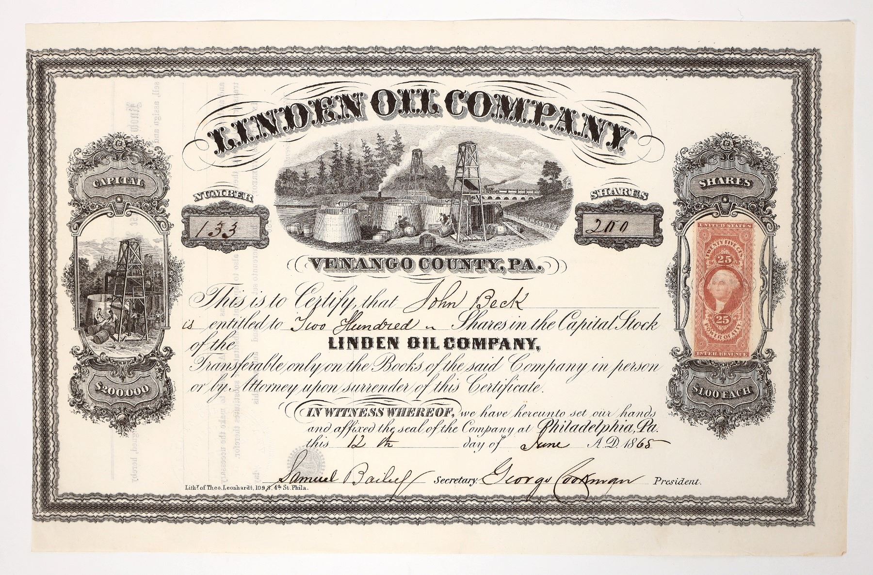 "Venango County, PA" printed under vignette. No. 133, issued for 200 shares to John Beck in Philadelphia in 1865. Signed by president George Cookman and secretary Samuel Bailey. Not cancelled. Black border and print and two different oil vignettes with derricks, tanks, and barrels. Lith. of Theo. Leonhardt. 25 cent US IR Power of Attorney stamp attached on the right. 7.5 x 11.75" Folds. According to a Sept. 1864 ad for the company, their property was situated at the mouth of Oil Creek. In January 1865, they paid a dividend.