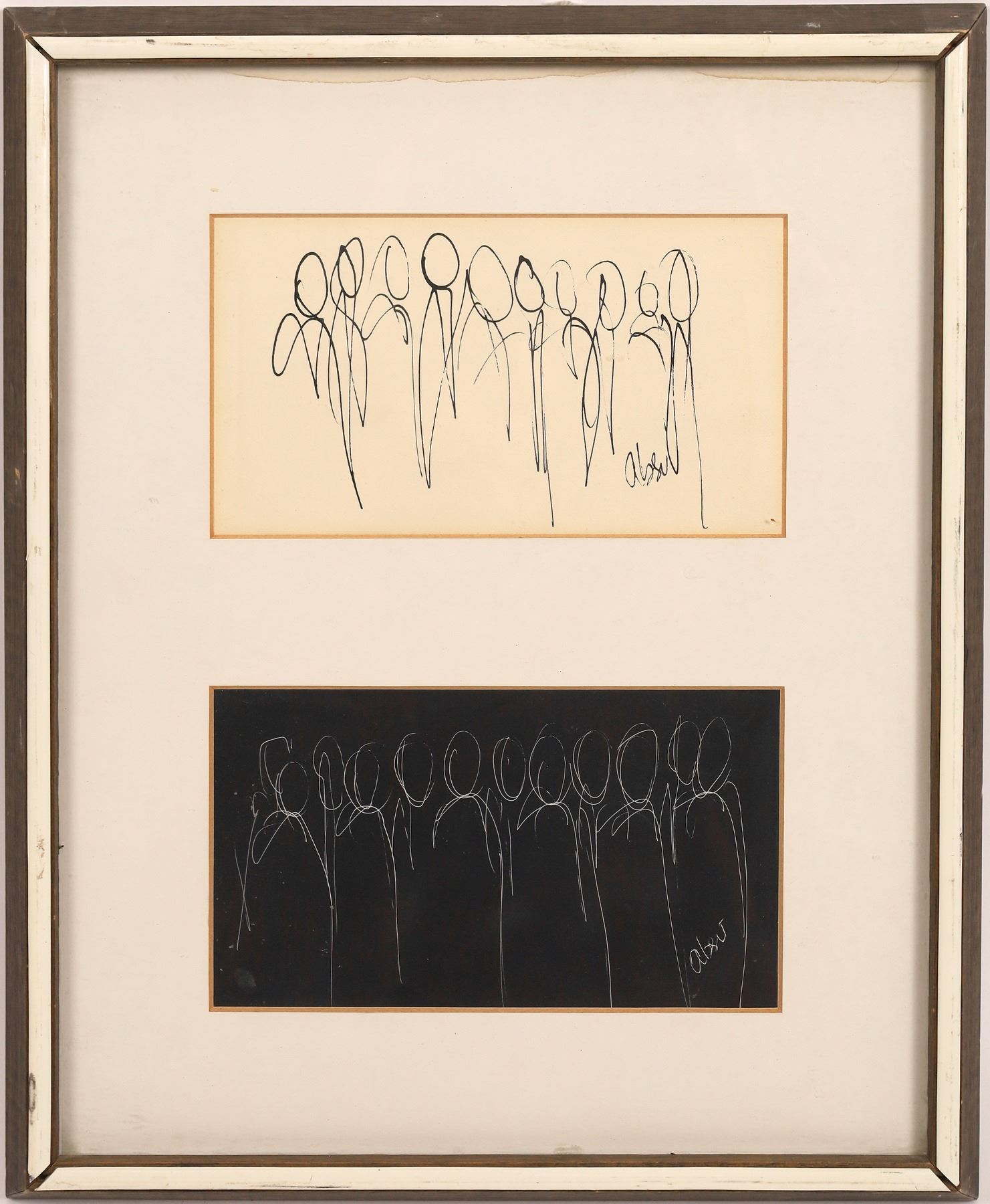 Drawings signed Absu. One black ink on off-white paper, other is white ink on black paper. Two images matted and framed together. Images, 4 x 6.75", framed, 15 x 12",