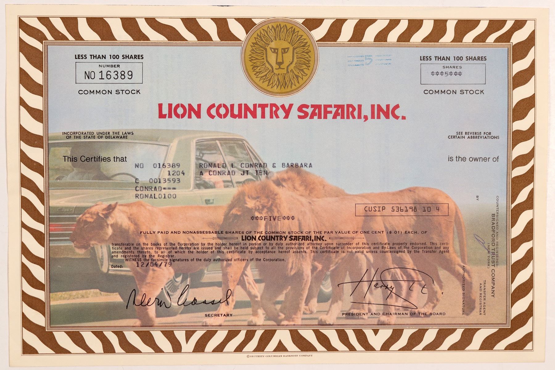 5 shares of Lion Country Safari, Inc. cert. # 16389 issued to Ronald L. Conrad & Barbara Conrad on Dec 4, 1979. Printed: Security Columbian Banknote Co. Excellent condition with outstanding color picture of lions. Countersigned and registered. Signed by president and chairman of the board and secretary. Lion Country Safari is home to over 900 animals in drive-through preserve and in Safari World exhibit area. Lion Country Safari has lions, white rhino, chimpanzees, zebra, giraffes and many other animals at their year round park.