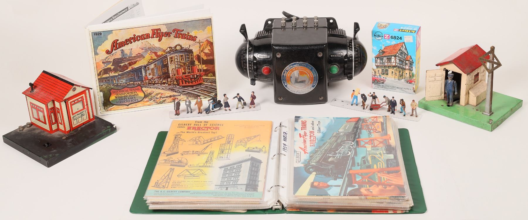 Lot of 17. A diverse collection of model RR in accessories 1. Collection of transformers all tested and working.: Lionel Dual Control Type ZW, MRC Dualpack N/HO , Autopulse Dual Control Transamp 1, Two Tyco transformers, Thunder Lane N-Scale Power Park, TECH MRC 280. 2. Pre-war Lionel Gateman 9missing gate arm), Marx Guard shack (missing gate), Hallmark Keepsake miniature train keepsakes (NIB,) These items not tested. 3. Fourteen American flyer figures mounted on display , American catalogs in indexed binder from1929-65, great reference material. 4. Z scale motel.restaurant NIB. DuPage construction set, instructions for a suspension bridge. There are bags of parts and appear that it is complete, however there was no to confirm. Oh, and a set of instructions on how to build w/TInkertoys.
