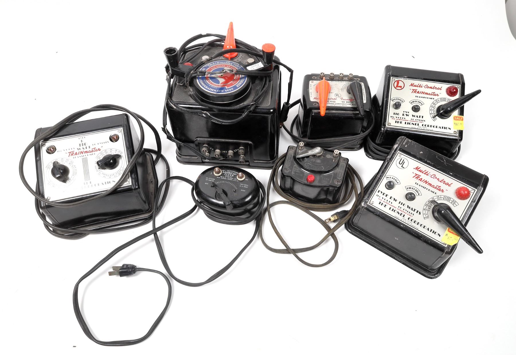Lot of 7. Lionel Trainmaster Type KW ( untested, cord frayed) no physical damage in or out, Type R dual control, Type RW (2) multi-control, type 1033 & 1053 multi-control, one American Flyer No. 1. All tested and work unless noted.
