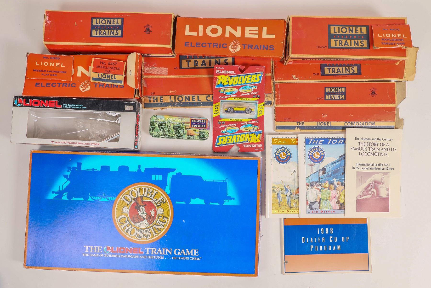 Lot of 20. 1. Five 36" 2 rail "O" scale track (one missing 4 ties), Eight Lionel empty boxes, Lionel train watch tin box (no watch), Lionel Revolvers race car NIB. 2. Four Lionel publications: Lionel Smithsonian leaflet on The Hudson and the Century Locomotives. 1998 Great Railway Adventure books "The Daylight Limited" and "The Torpedo Run" excellent cond. !998 Dealer Co-Op Program. 3. The Lionel Train Game "Double Crossings", a[[ears complete and in excellent cond.