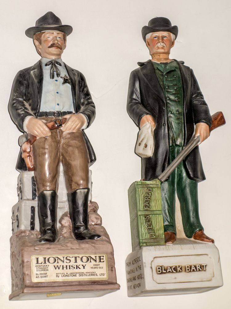 1) Black Bart McCormick Straight Bourbon Whiskey decanter. Distilled and bottled in Weston, Missouri. RARE. 2) Original Porcelain bourbon whisky decanter from Lionstone Distilleries Lawernceburg, Kentucky. The rear label reads title of the sculpture with full description of his profession in the old west. The Wells Fargo Driver is wearing a black jacket over a pale shirt. Both are empty.