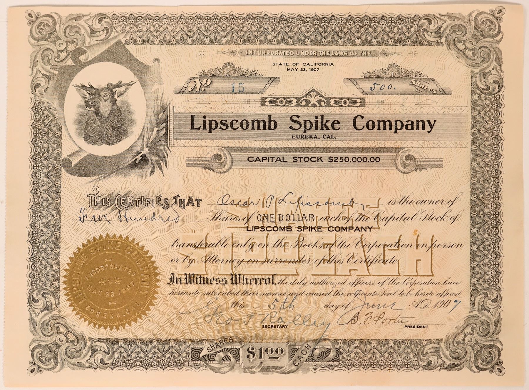 Interesting stock certificate we have not seen before from the Lipscomb Spike Company, Eureka, California issued in 1907 to Oscar P. Lipscomb. He is listed as a farmer in the Eureka directories and there is a Mary Lipscomb listed as a rancher. We can't tell whether this company was manufacturing railroad spikes or distributing someone else's product. This company is not listed in Cox. The company's charter was revoked by December, 1907, so maybe they never really got off the ground.