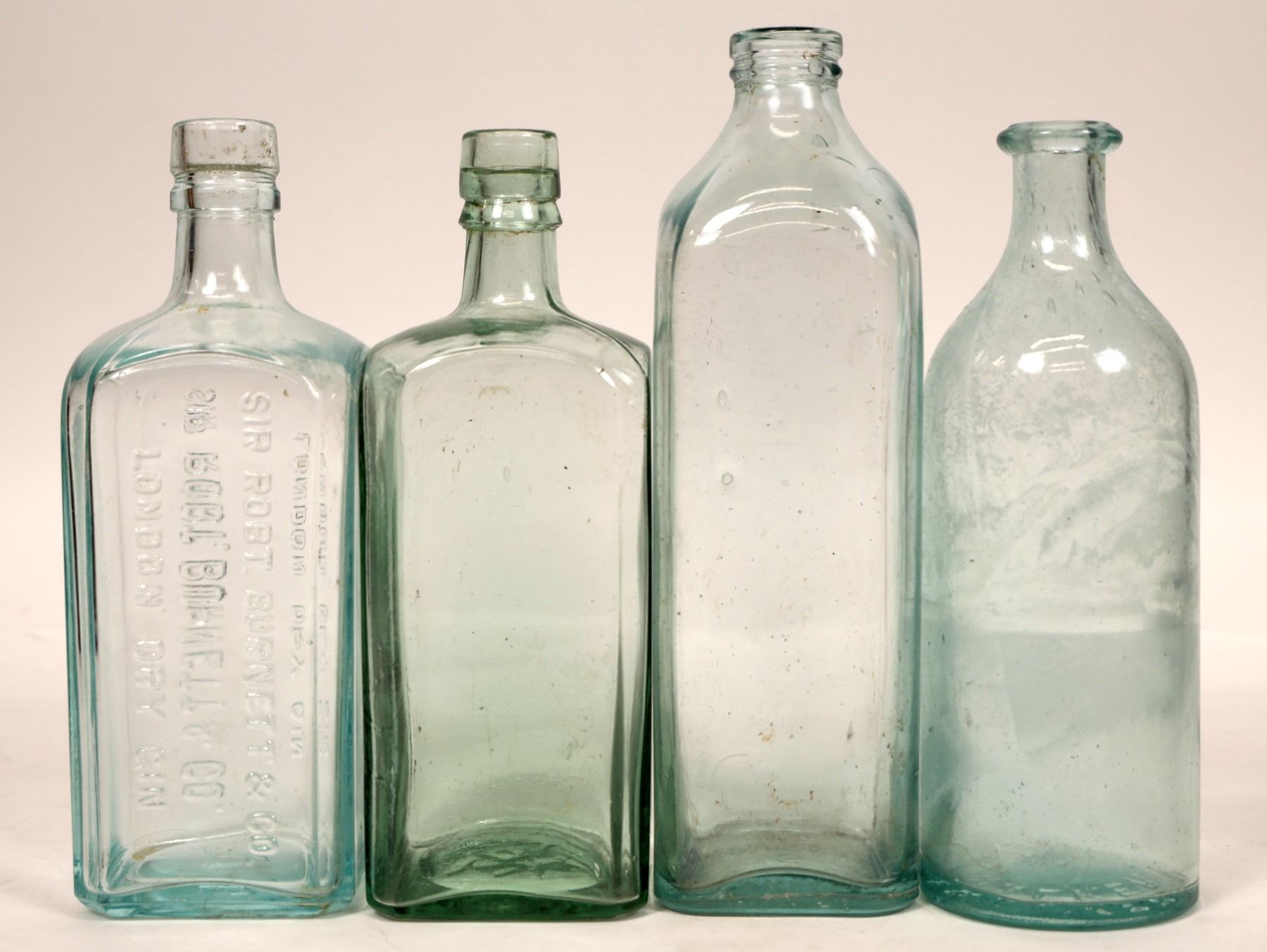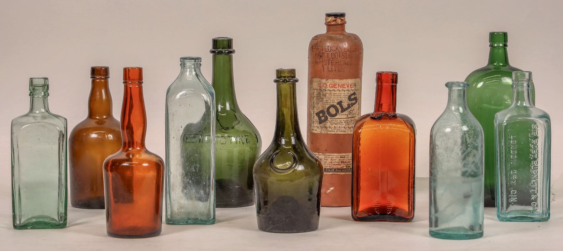11 assorted gin and liquor bottles. Squat brown/aqua 8", unmarked aqua-drug store? 8.25", green Benedictine 9.5" and 9", unmarked amber long neck 9.25", light aqua unmarked early Gordon's Gin 8.25", light aqua Burnett gin 8.5", Boll's Gin 12", light aqua Walkers Whiskey 9.5", unmarked oval green 10.5", amber Cointreau 8.5".