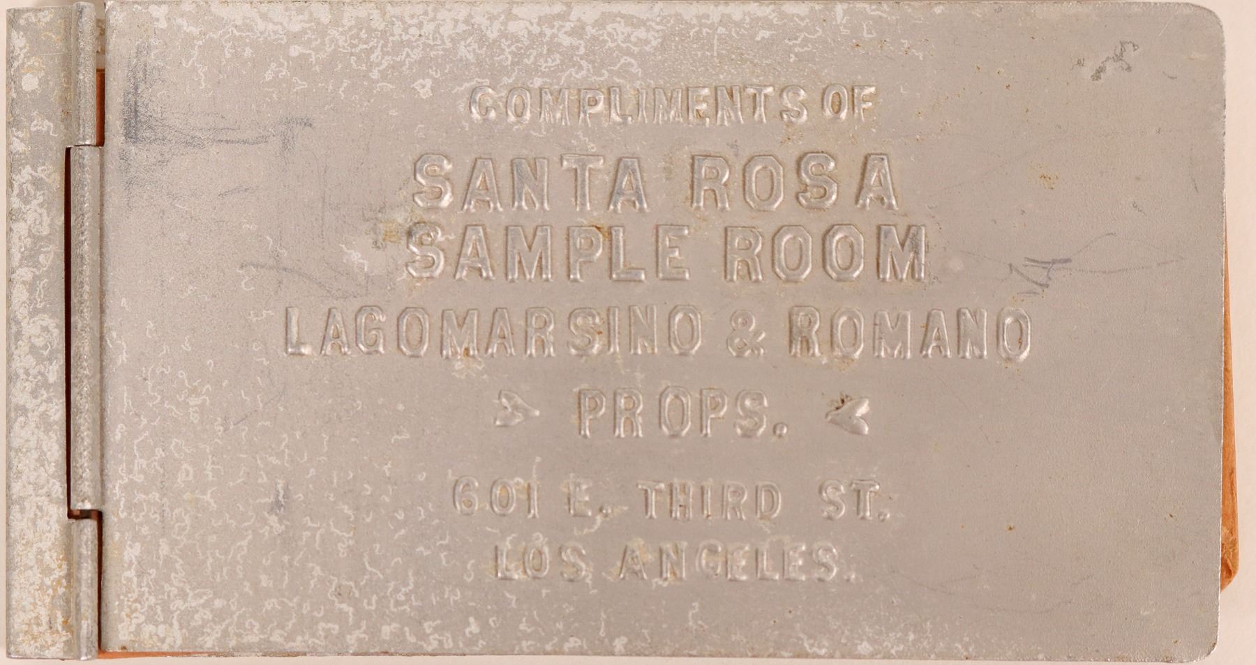Small metal writing tablet, compliments of The Santa Rosa Sample Room in Los Angeles.