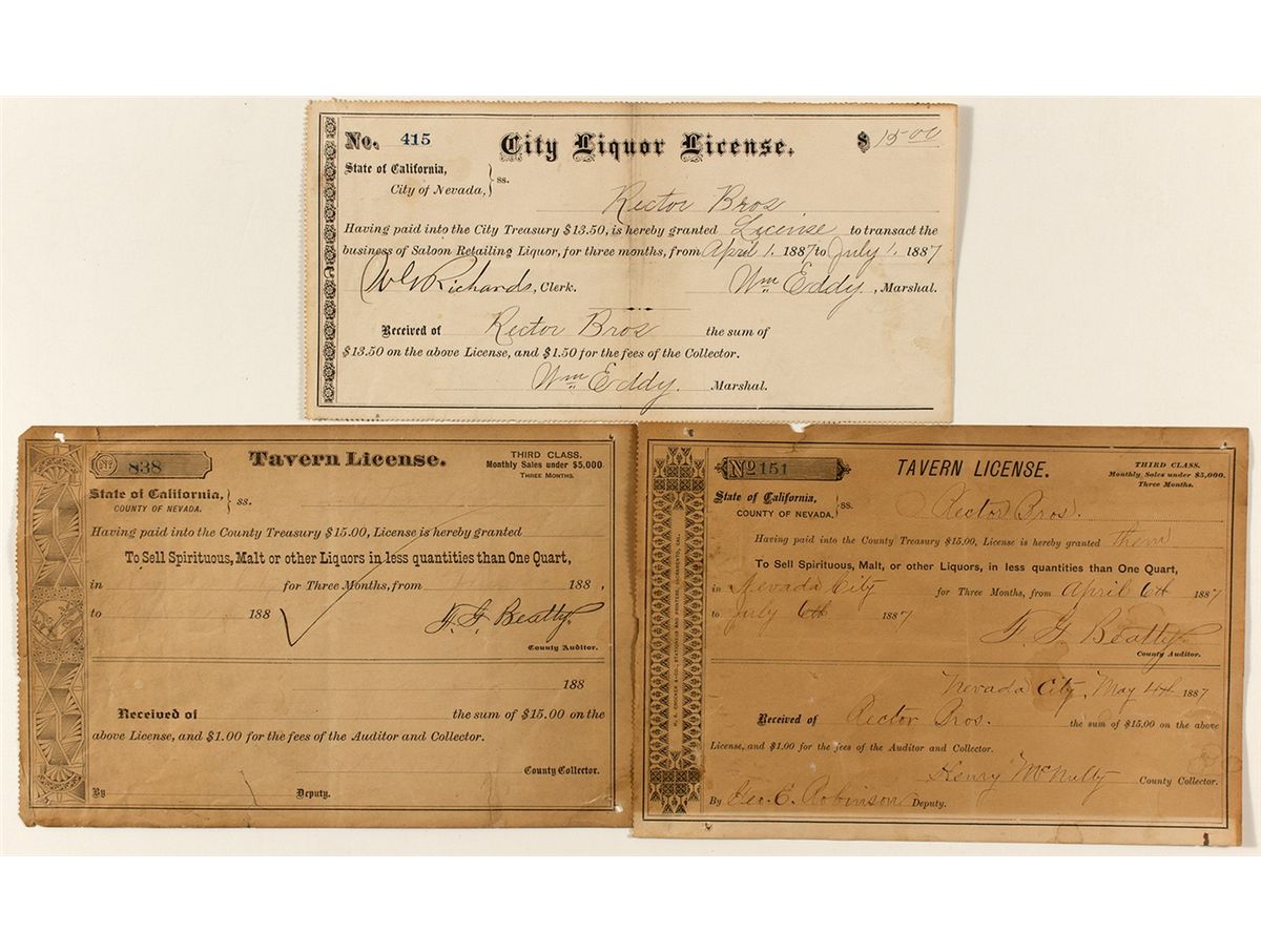 This is a lot of 3 fabulous pieces from the booming years of Nevada City! The Rector Brothers came to California in 1874 and eventually became the proprietors of the Union Hotel in Nevada City. In 1886, the two acquired the National Exchange, which became known as the National Hotel. All 3 of the following pieces in this group were issued to the Rector Bros. 1) Three month tavern license, no. 151. It is dated April, 6, 1887 and was good until July 6, 1887. The piece has some wear, including some pin holes on the corners. 2) Three month tavern license, no. 838. It was dated sometime in January and good until April of 1887. The writing is extremely faded on this piece. 3) Three month liquor license no. 415. It was good from April 1 to July 1 of 1887. This piece has some wear including a large crease down the center. [REF: A Memorial and Biographical History of Northern California]City: Nevada CityCounty: Nevada CountyState: CADate: 1887