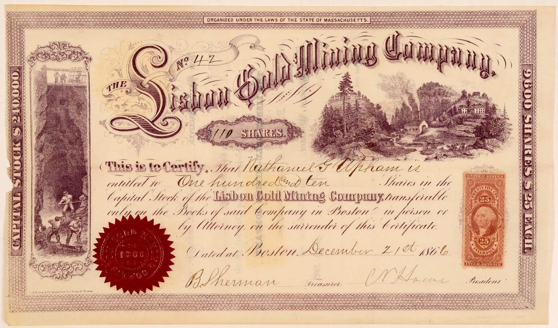 Inc. in Massachusetts. Cert. #42, issued in 1866 for 110 shares to Nathaniel G. Upham and signed by CN Howe as president and B. Sherman as treasurer. Two nice vignettes of a millsite in the hills and miners down the shaft at left. In 1865, J. Henry Allen and Charles Knapp, independently of each other, discovered free gold on the David Atwood estate in Lisbon. This led to the organization of the Lisbon Gold Mining Company in 1866. Most of the gold was within 20 feet of the surface and came to about $60 per ton. The company only produced about $300 and was not very successful. They then purchased one half of the Dodge mine at Lyman, about two miles away. A new company was formed to mine one half of the property called the Dodge Gold Mining Company (Report of the Geologic Survey of the State of New Hampshire, 1869). Very attractive certificate and mining stocks from New Hampshire are rare. This is a great discovery piece and might be unique.
