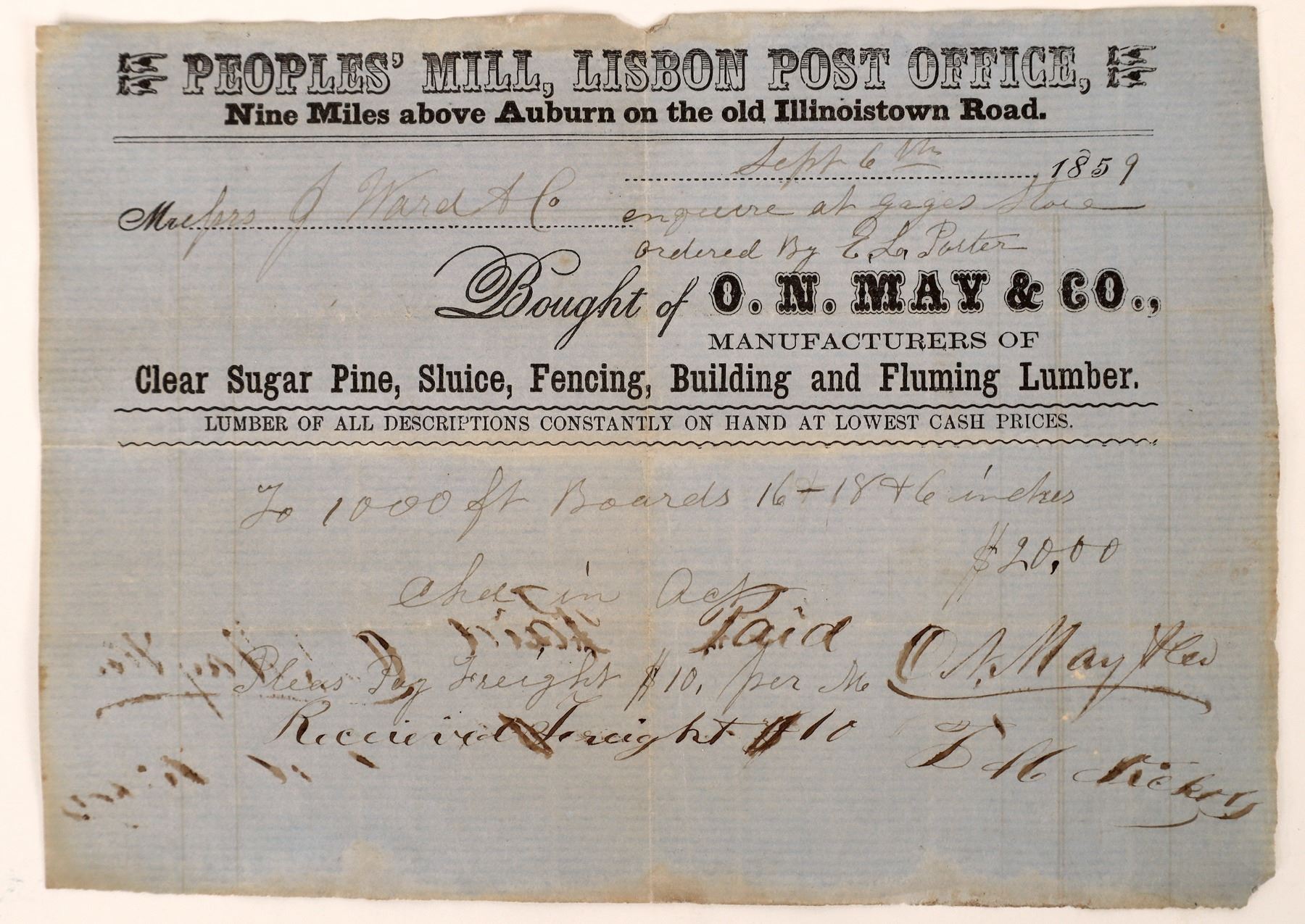 A receipt dated 1859 for O.N. May & Company for mine construction supplies. The company declares that they have "lumber of all descriptions at lowest cash prices."