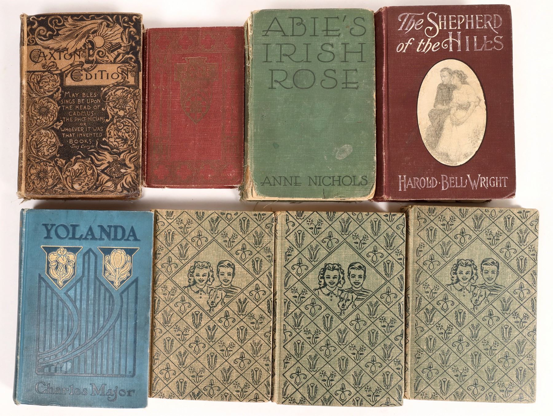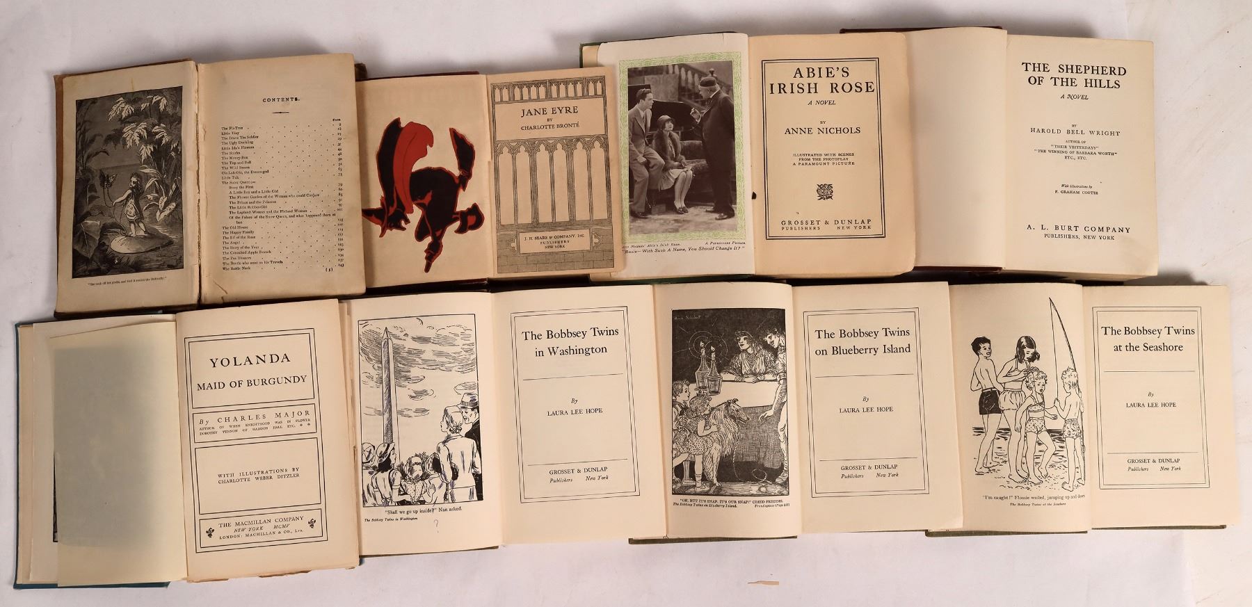 Vintage literature and fairytale books. Includes three different Bobbsey Twins novels by Laura Lee Hope (1940s), Yolanda: Maid of Burgundy by Charles Major (1905), The Shepherd of the Hills by Harold Bell Wright (1907), Abie's Irish Rose by Anne Nichols (1927), Jane Eyre by Charlotte Bronte (1920), and Andersen's Fairy Tales Caxton Edition (1886). Some of these books have poor binding.