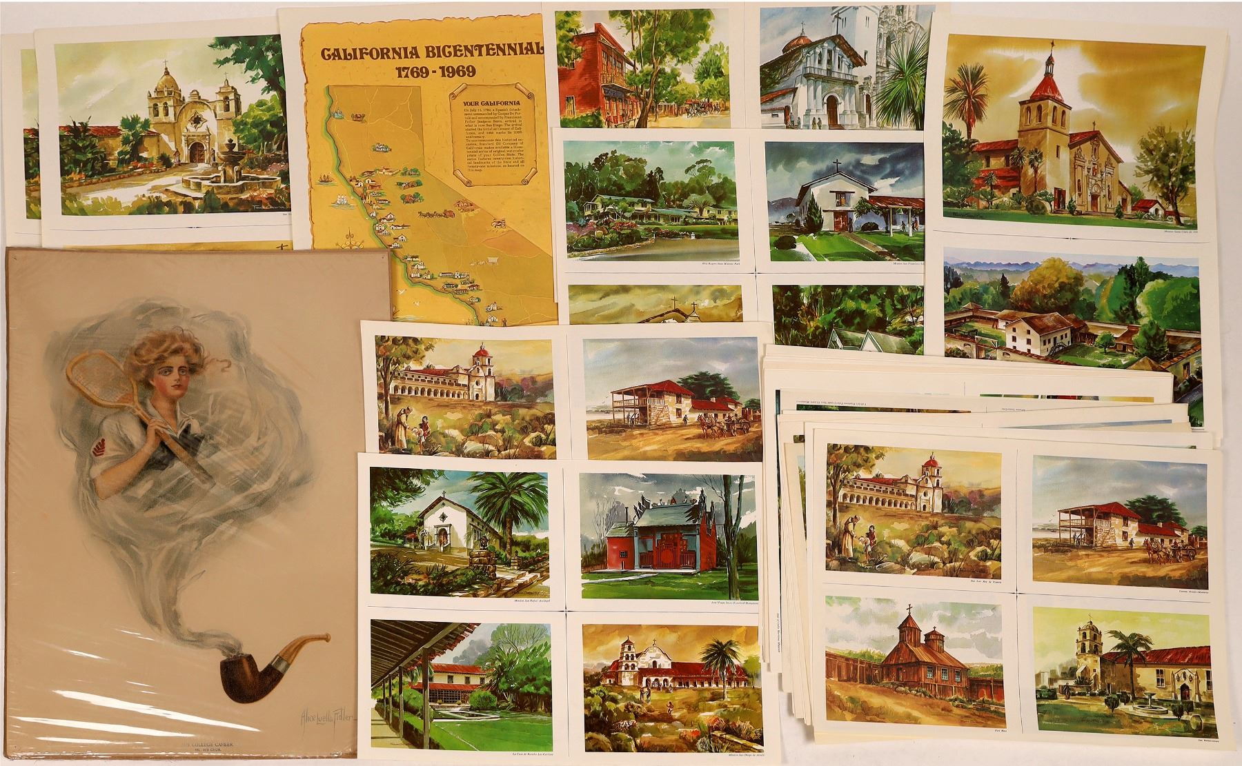Approx. 36 Bicentennial Print Series many missions & historic parks & ships from Maritime Museum & many more. Very good condition, colors are vivid. Many of the prints were by Francis Carpenter. Also includes 1 poster signed by Alice Luella Fedler entitled "His College Career VII His Chum" No. 11520, copyright 1900 by the US Lithograph Co., Cin. & N.Y. Published by the Decorative Poster Co., in Cincinatti. 15" x 20". Little staining (1") bottom right, please inspect. Ready to frame.
