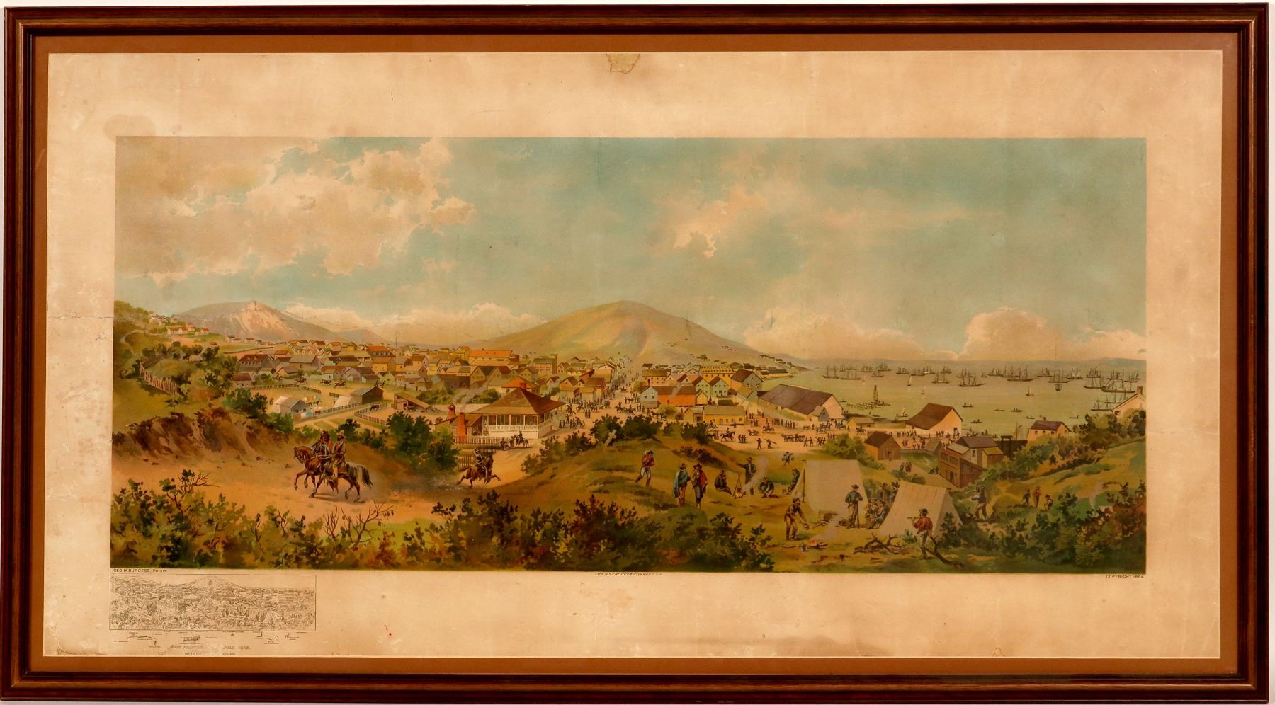 Here is a really great piece of California history . This colored lithograph depicts San Francisco, and the bay in July 1849, with Telegraph Hill in the background. Under the picture is embossed : Geo. A. Burgess, Pinxit. / Lithograph by H.S. Crocker / Copyright 1894.// The condition is pretty good, for a 125 year old lithograph. One repair at the top, and a small tear at the left side which looks like a crease. Also some brown aging, but overall really nice condition. Anyone would be proud to have this item, over their doorway, or on the wall. These were the days when people cam from everywhere, to go to the gold fields, that's why they called them the 49'ers !! Don't miss this, these lithographs are really rare , and hard to find.( RH).