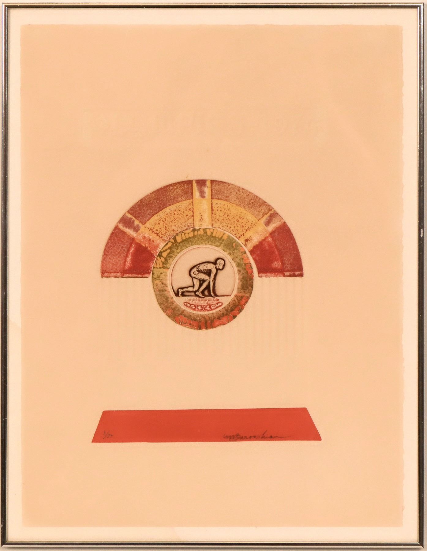 Embossed lithograph--Okympics-1976, features a central medallion of a runner in a starting crouch. Surround is geometric, yellow, red and blank embossed. Signed and numbered--3/75. 14.5" x 11", framed: 16" x 12". Very good condition. Martin Barooshian (born 1929-) an American painter and printmaker, known for his ability to weave a tapestry of art historical influences with modernist elements and a contemporary sensibility.