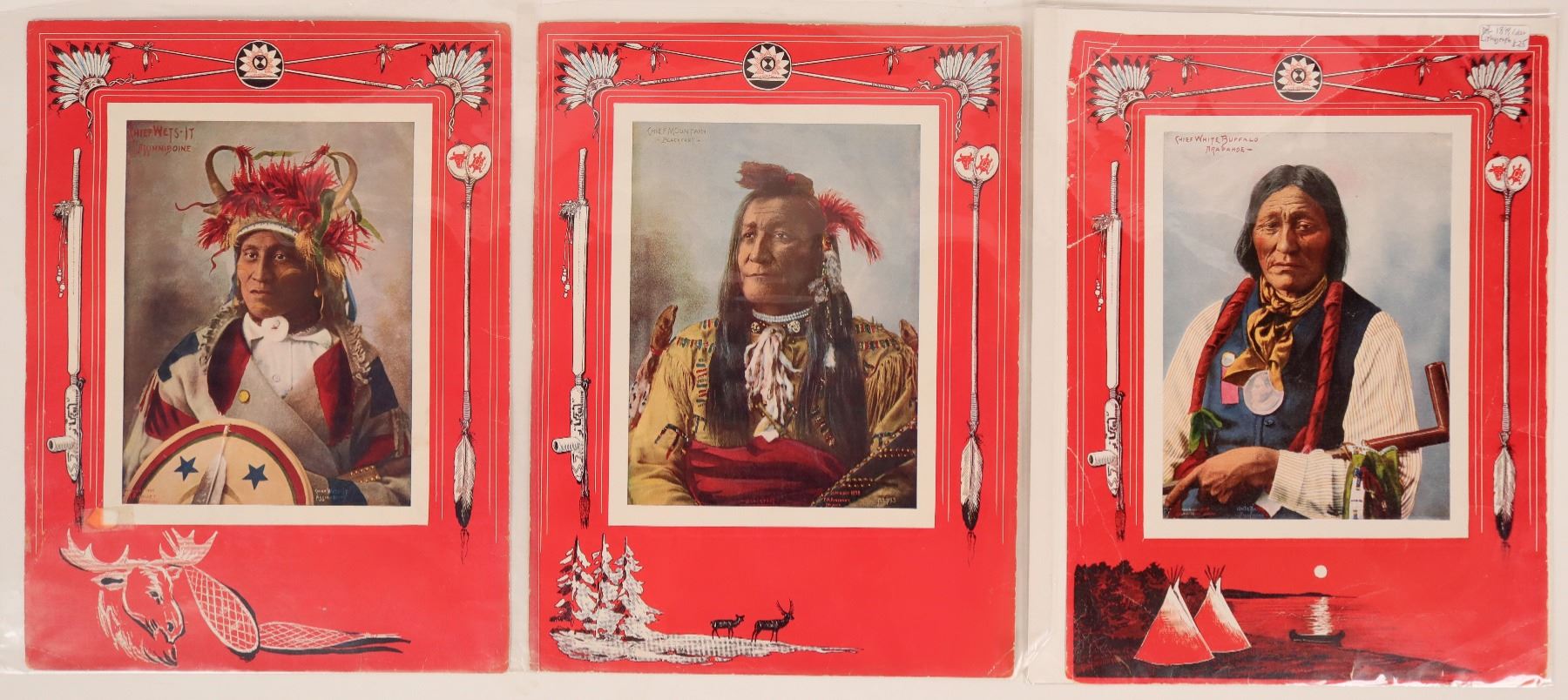 This is a grouping of three large lithographs of Chiefs Mountain, Blackfeet; White Buffalo, Arapahoe; and Wets-It, Assinniboine. 10 in. X 13.5 in. published by F.A. Rinehart 1898. All in very good conditon.