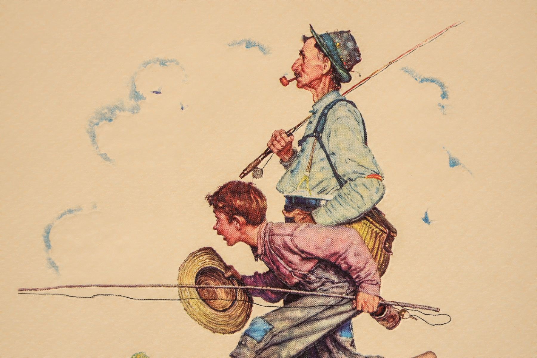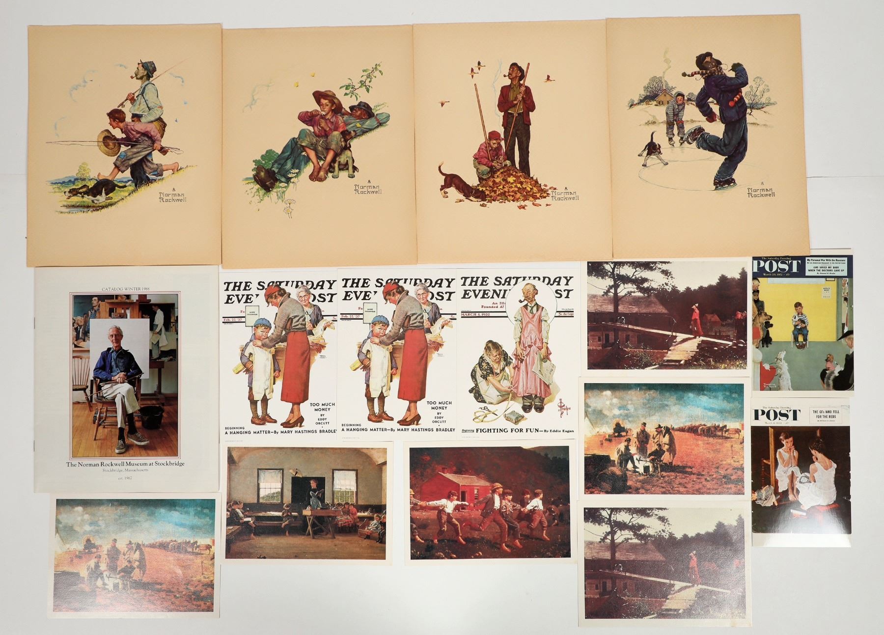 Group of lithographs/prints of the work of American artists, largely Norman Rockwell. Lot includes 8 lithographs of the work of Winslow Homer, 6 lithographs of Saturday Evening Post covers (many by Rockwell), a booklet from the Norman Rockwell Museum advertising prints, and 4 excellent Rockwell prints using a unique embossed effect. All in great condition.