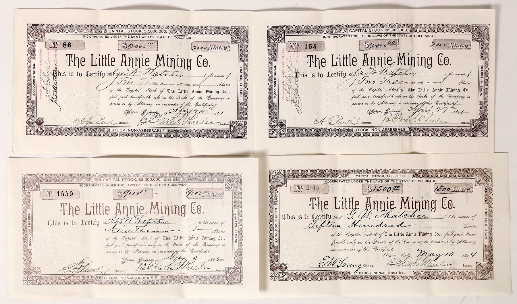 Lot of 4 The Little Annie Mining Company stock certificates from the Aspen-Roaring Form Mining District in Colorado.