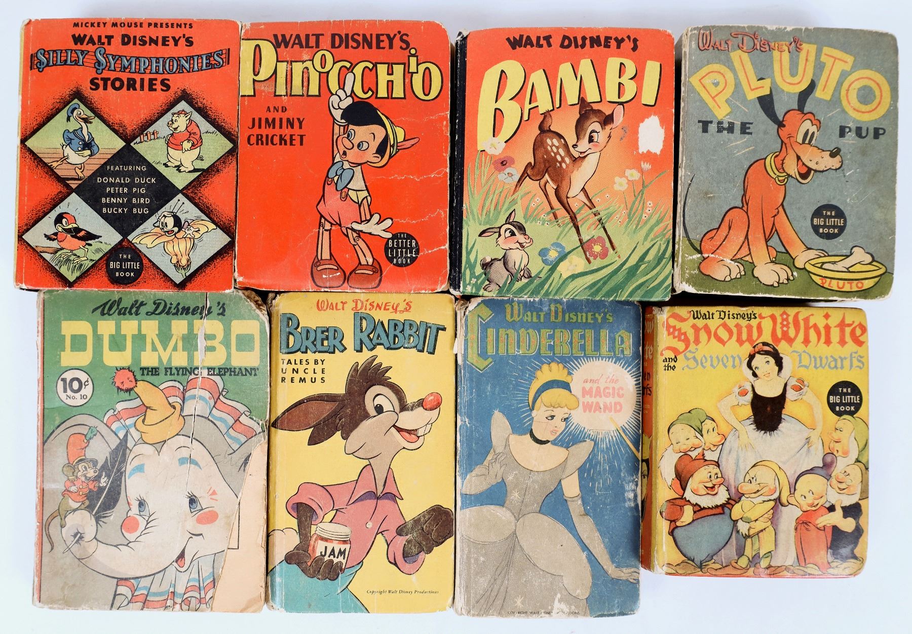 Eight Little Big Books featuring Disney charters. Snow White, Dumbo, Cinderella, Bear Rabbit, Bambi, Pluto, Pinocchio, Silly Symphonies. Fair to good condition.