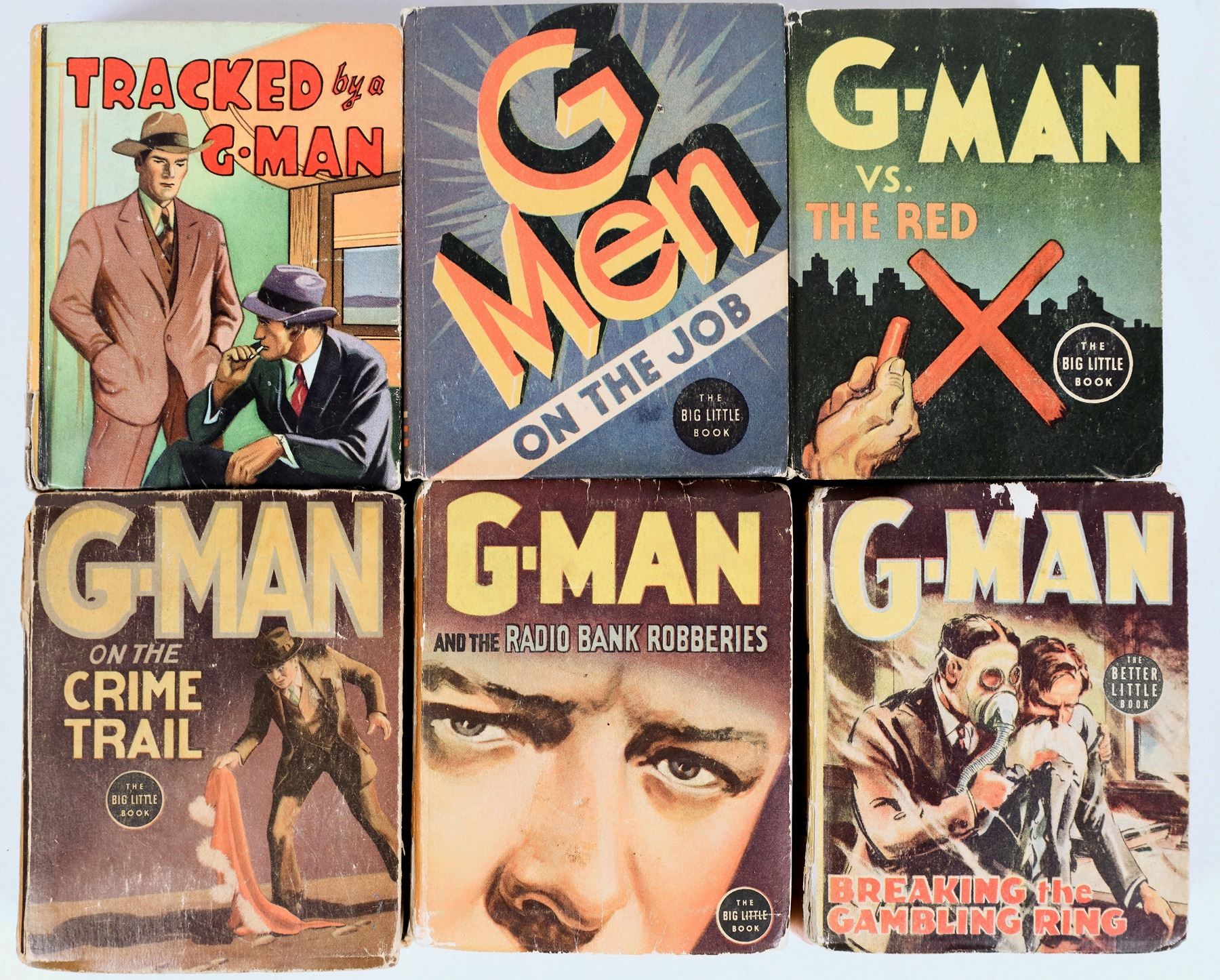Six Little Big Books in the G-Man series. Tracked by a G-Man, G-Man vs the Red X, G-Man and the Radio Bank Robberies, G-Man Breaking the Gambling Ring, G-Men on the Job, G-Man on the Crime Trail. Fair to good condition.