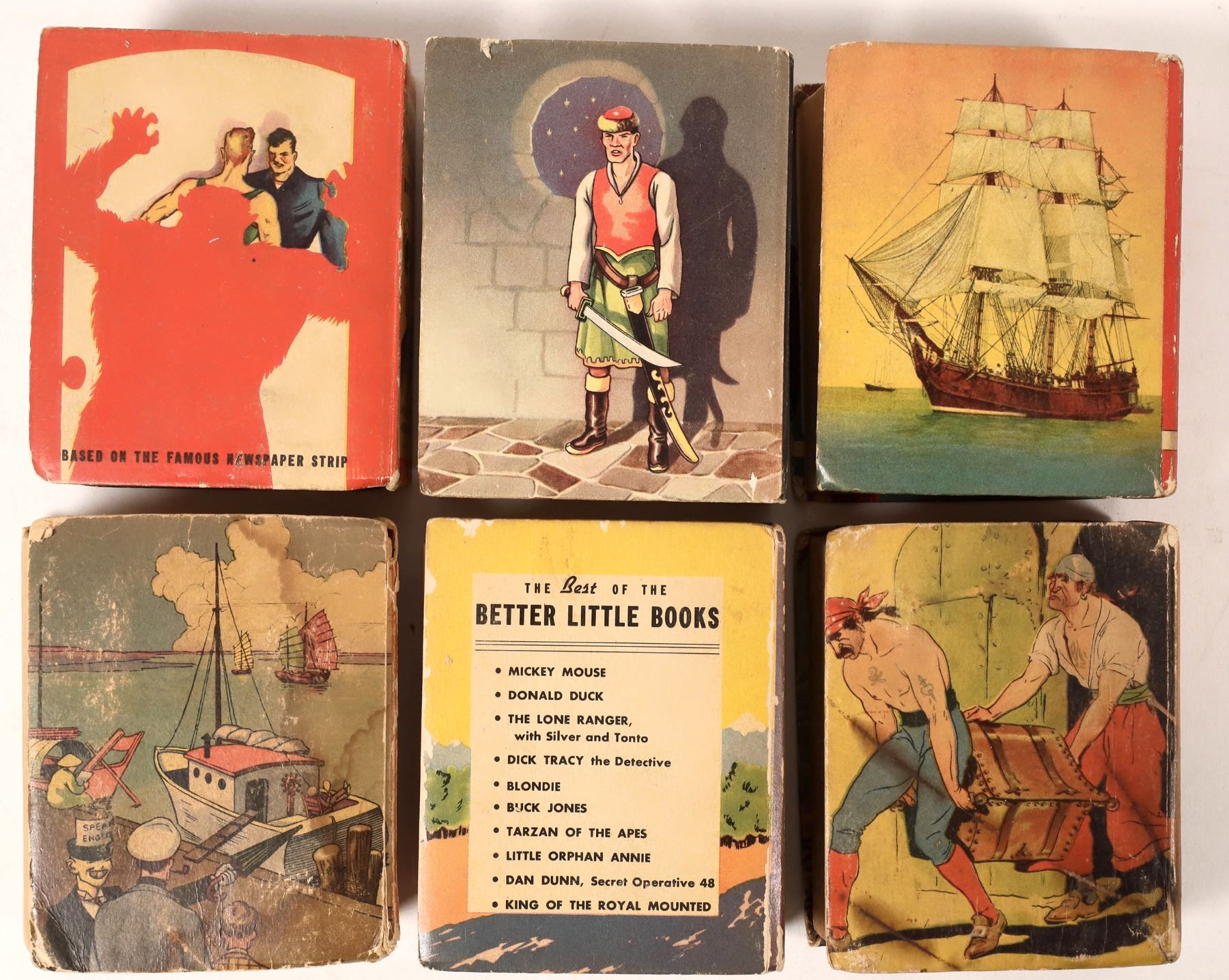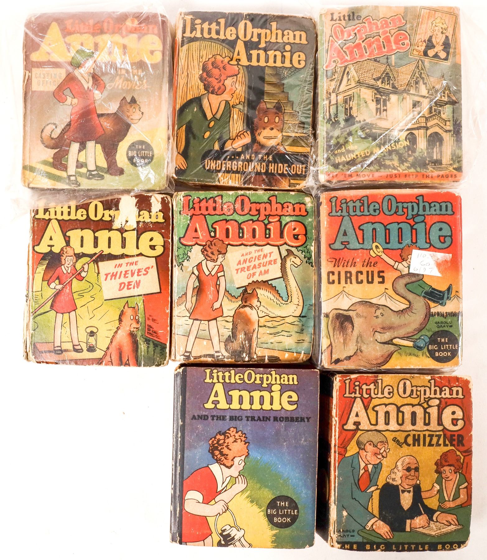 Eight Little Big Books featuring Little Orphan Annie. Little Orphan Annie and the Big Train Robbery, Little Orphan Annie with the Circus, Little Orphan Annie in the Movies, Little Orphan Annie and the Ancient Treasure of AM, Little Orphan Annie and the Haunted Mansion, Little Orphan Annie and Chizzler, Little Orphan Annie and the Underground Hide-out, Little Orphan Annie in the Thieves Den. Fair to good condition.
