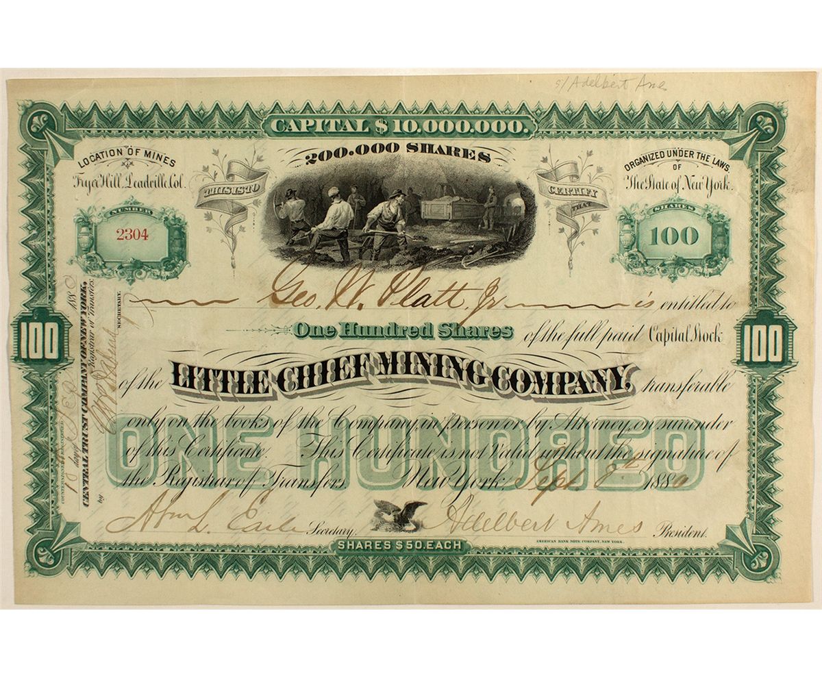 Inc. in New York. No. 2304. Uncancelled. Issued for 100 shares to Geo. W. Platt, Jr. on Sept. 8th, 1880 in New York. Signed by Ames (president) and Eaile (secretary). Reverse not signed. Green and black print with an ornate border. Vignette of seven miners working various jobs underground. Small vignette of eagle at bottom. Location of Mines: Fryer Hill, Leadville, Col. Printer: American Bank Note Co., New York. Measures approx. 10 ½" x 6 ¾." Condition: toning and folds. Included is a photocopy of a 1912 correspondence to the company from the estate of George Platt. According to Swift, this was one of the richest mines on Fryer Hill, with ore bodies up to 80 ft. thick.City: LeadvilleCounty: LakeState: CODate:
