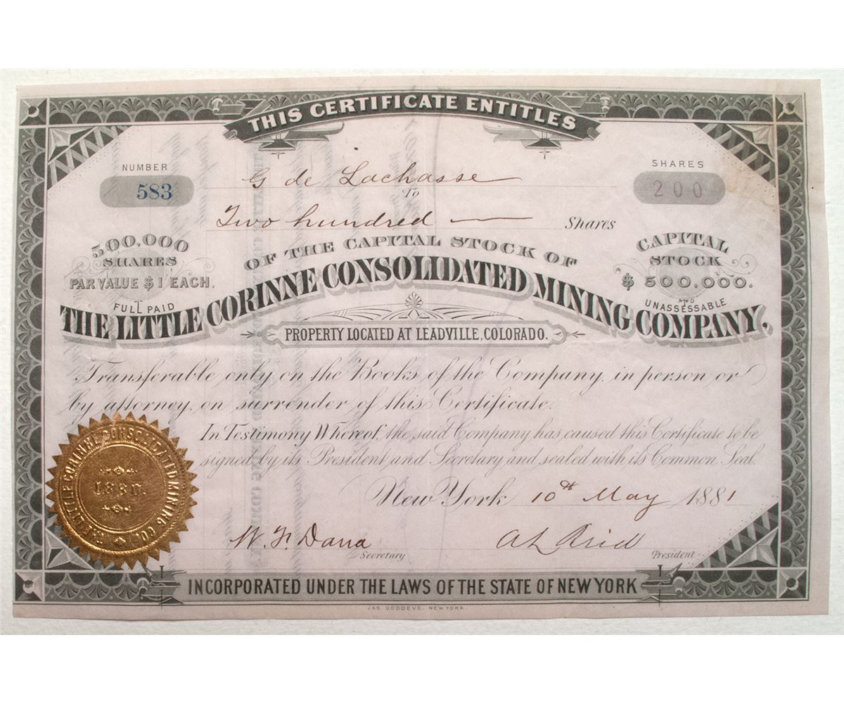 Incorporated in 1880 in New York. Cert. #583, issued to G. de Lachasse for 200 shares. Signed by A.L. Arid, president, and W. F. Dana, secretary. “Property Located at Leadville, Colorado” is printed beneath masthead. Light pink paper with gilt seal. Printer: Jas. Goodeve, New York. Datelined New York. U/C. From the greatest of all Colorado mining regions. Mining in the Leadville region began in 1859 and enjoyed its subsequent boom and bust cycles with placer mining, then silver, and finally with its gold rush. VF. Rare.