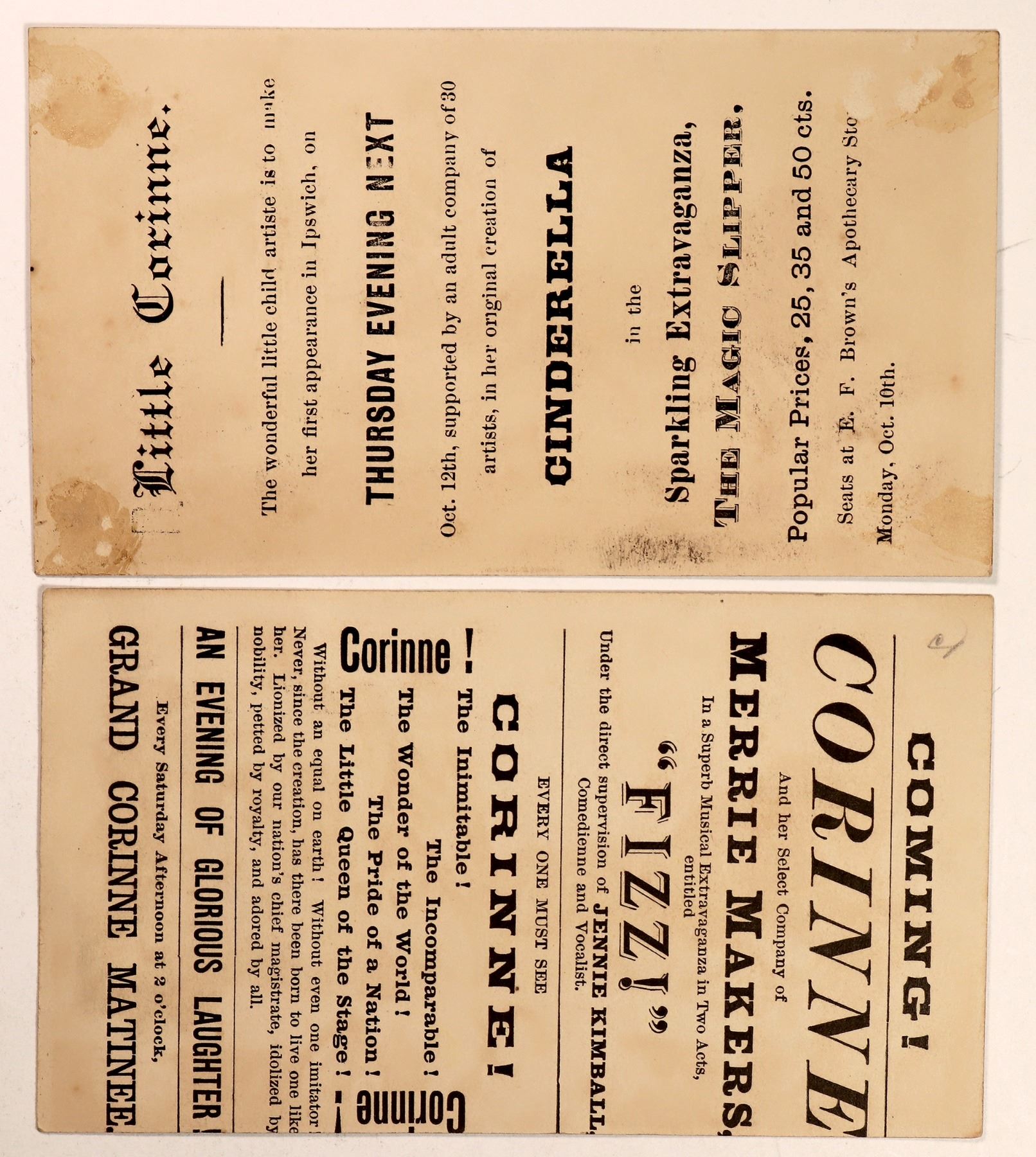These illustrations depicts Corinne, a juvenile actress-singer, arriving in a horse-drawn coach to cheering crowds. Corinne was managed by her mother Jennie Kimball also a stage actress & in the Merrie Makers company. Text printed on the card verso states that Corinne will perform in "Fizz" & "Cinderella". It doesn't give the venue, but it does state that seats are available at E.F. Brown Apothecary Store. Cards measure 3"x 5" & are in decent condition. Please see photos for more details. [Boston Massachusetts