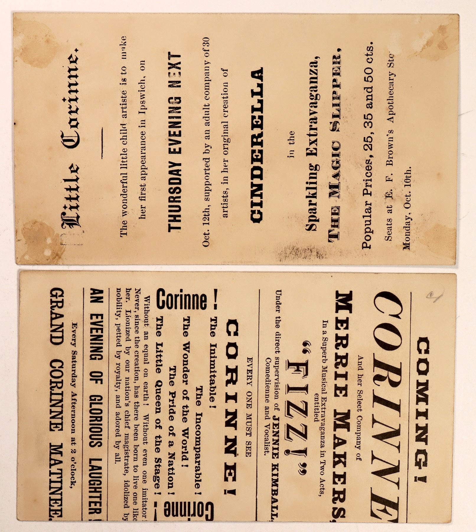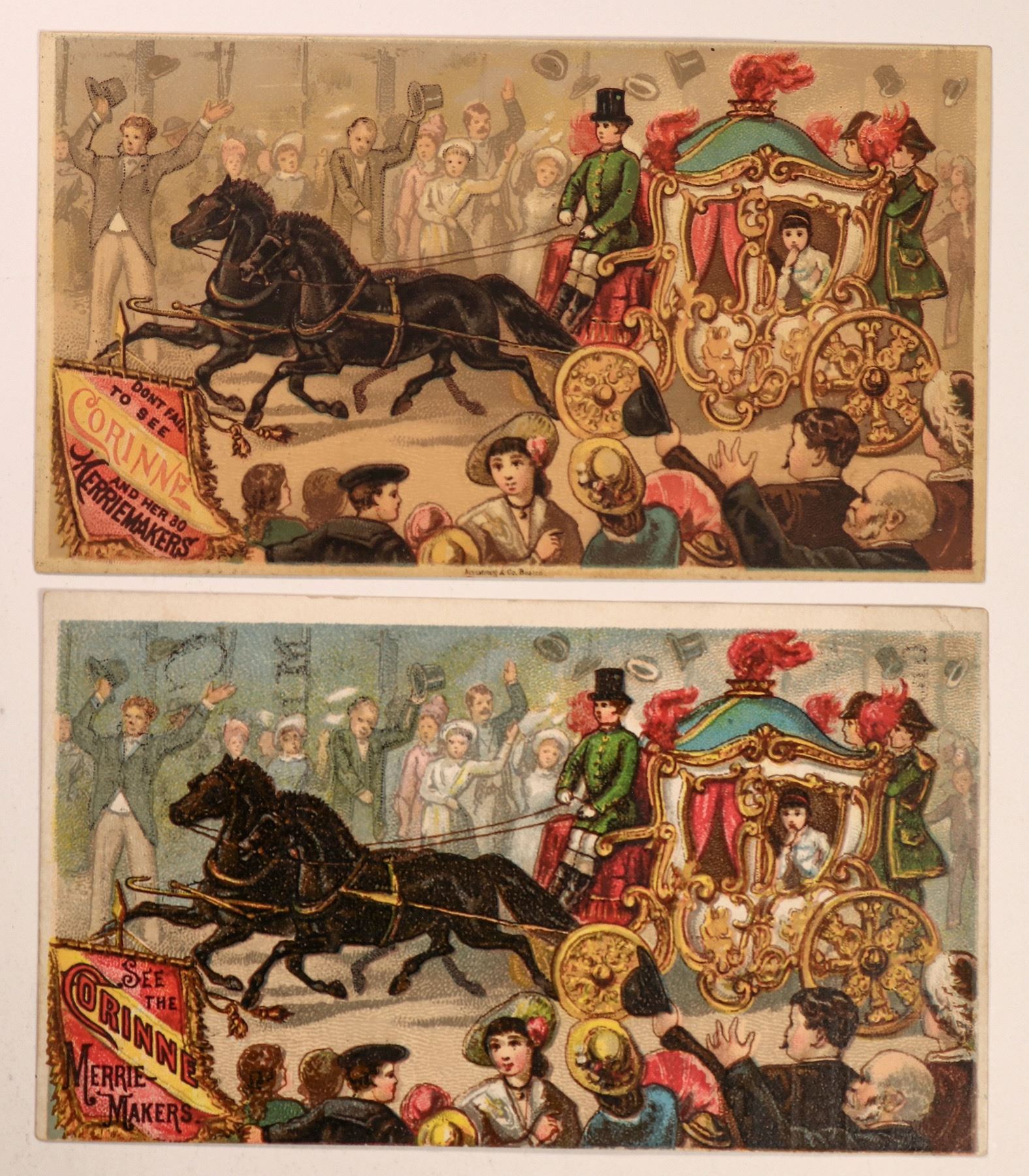 These illustrations depicts Corinne, a juvenile actress-singer, arriving in a horse-drawn coach to cheering crowds. Corinne was managed by her mother Jennie Kimball also a stage actress and in the Merrie Makers company. Text printed on the card verso states that Corinne will perform in "Fizz" and "Cinderella". It doesn't give the venue, but it does state that seats are available at E.F. Brown Apothecary Store. Cards measure 3"x 5" and are in decent condition. Please see photos for more details.