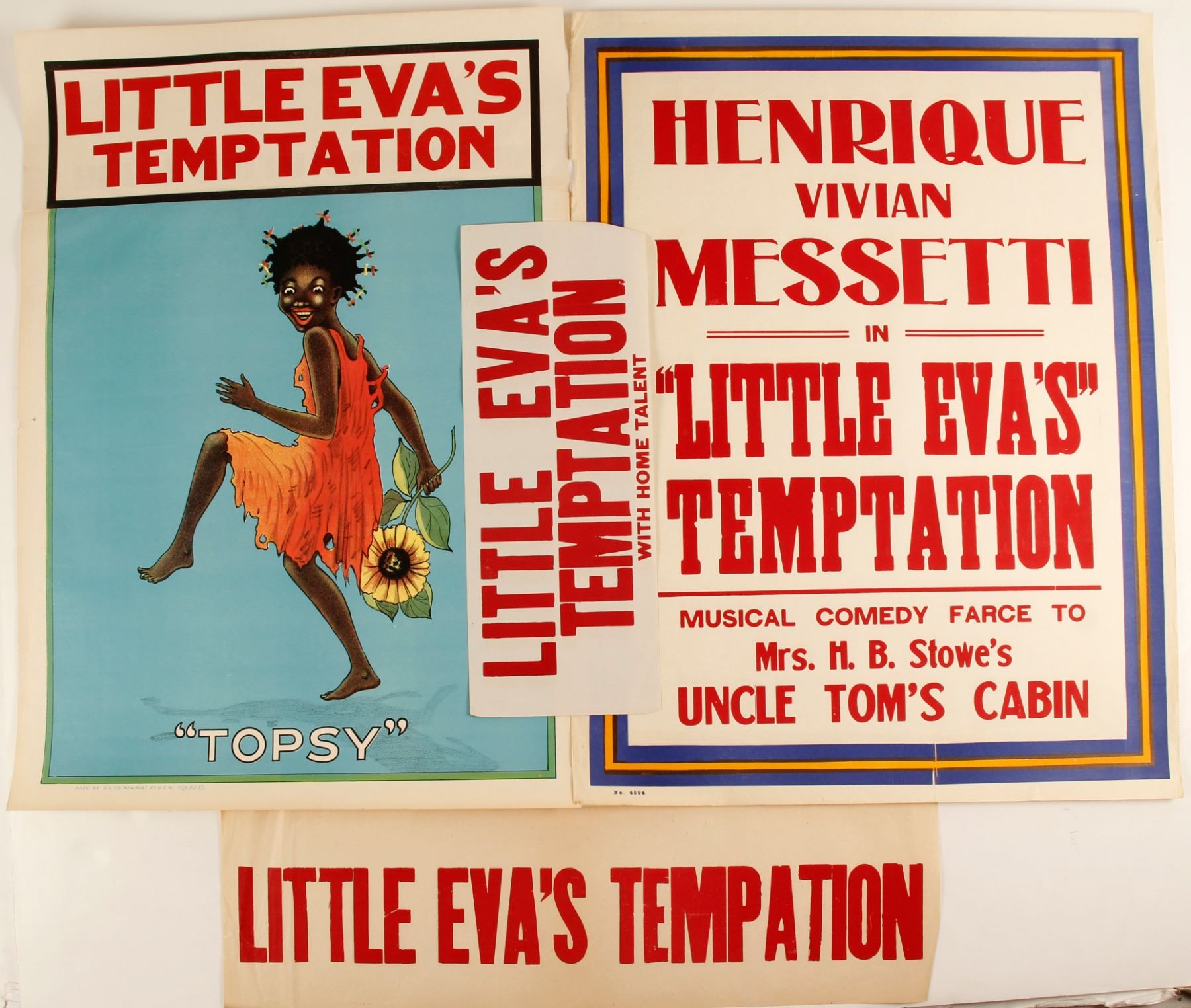 1) Little Eva's/Temptation /With Home Talent 17"x 6.5"; 2) 25" x 7"; 3) Henrique Vivian/ Messetti 28" x 21", #4594; 4) "Topsy", made by D.L. Co. Newport KY USA #4825. Topsy poster is repaired with tape on reverse. Please inspect. Very nice collection. Provenance, James Mackie Collection.