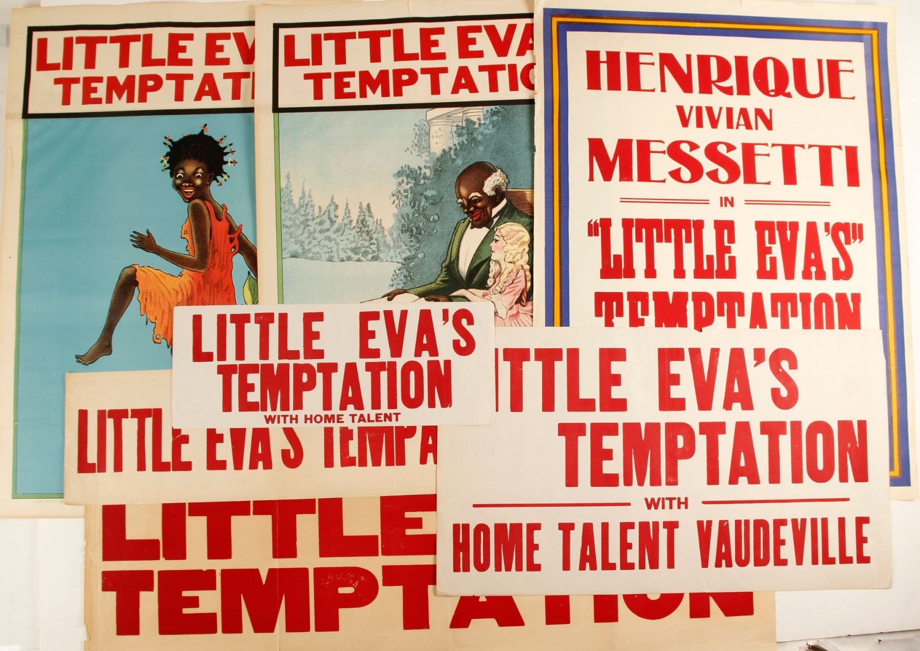 4 Banner style posters (different sizes) & 3 posters in this lot. 1) Banner style, Little Eva's Temptation 32" x 12"; 2) 24" x 7"; 3) 17" x 6.75" Little Eva's Temptation With Home Talent; 4) Henrique Vivian Messetti/Musical Comedy Farce to Mrs. H.B. Stowe's Uncle Tome's Cabin, No. 4594; 5) Poster of "Topsy" Made by D.L. Co. Newport Ky. U.S.A. #4825; 6) "Uncle Tom & Eva" 20" x 28" Made in USA By D.L. Co. Newport KY #4824. Subtitled "A Farce Comedy Suggested by Uncle Tom's Cabin," this musical burlesque was written in the late 1920s by Henrique Vivian Messetti. Not much is known about either the performance history of the piece or the man who wrote and starred in it. According to the catalog at the Library at the University of California, Davis, the source for the material in this part of the archive, Messetti was a "member of a vaudeville-circus family active during the 1920's-1940's." In addition to Eva's Temptation, he produced and toured California in shows called "Messetti's Great Road Show" and "Messetti's Musical Entertainers." It is not clear what part Messetti took in his version of Uncle Tom's Cabin -- as posters for his "Musical Entertainers" suggest, in some of his shows he apparently performed in blackface and in others as a female impersonator. (Courtesy of Department of Special Collections University of California Library Davis, California) The Posters, "Topsy" & "Uncle Tom's Cabin" have been repaired at top on reverse side with tape. Posters are very delicate & tearing in margins, but does not encroach on posters. Please inspect. Great collection for those interested in "Little Eva's Temptation". Provenance of James Mackie Collection.