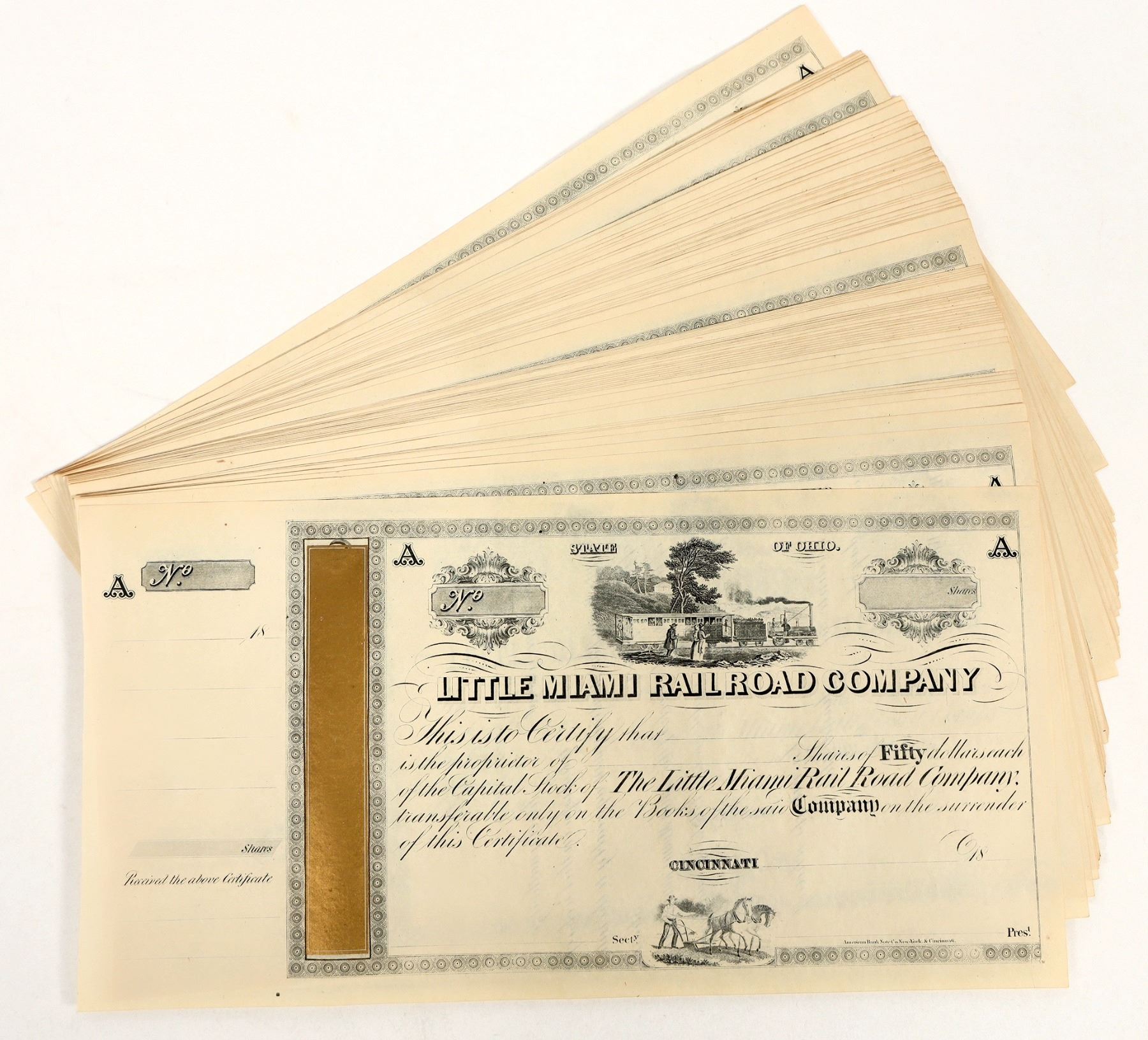 Group of approx. 70 unissued stock certificates for $50 shares in the Little Miami Railroad Company of Ohio, all dated 18XX. Little Miami was an important connection between Columbus and Cincinnati in the late 19th century. All uncancelled. Nice vignettes. 11.25"x6" certs, all in great condition; see photos.