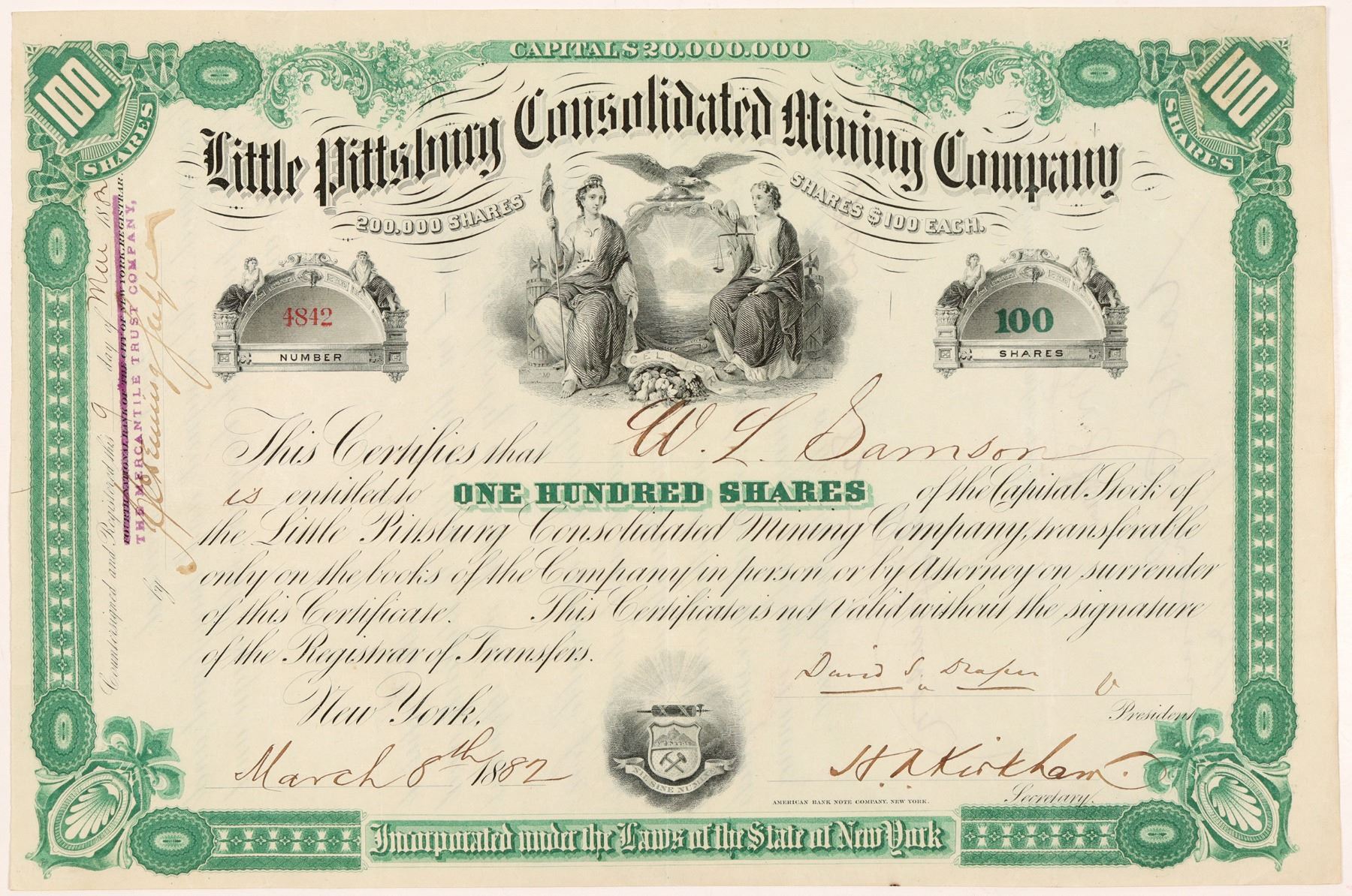 Inc. in New York. No. 4842, issued for 100 shares to WL Samson on March 8th, 1882. Signed by vice president David S. Draper and secretary H. Kirkham. Not cancelled. Green border, black print, allegorical vignette. Printed by ABN. 7.5 x 11" Folds, pinholes, creases. This was an important Leadville mining company. They owned the Little Pittsburg, New Discovery, Dives, Union, and Winnemuck on Fryer Hill, California District. Located in 1878. Developments included 2,000 ft. of shafts, considerable stoping. Paid over $1 million in dividends. [Corregan & Lingane, 1883, pg. 424] State: Colorado City: Leadville Date: 1882