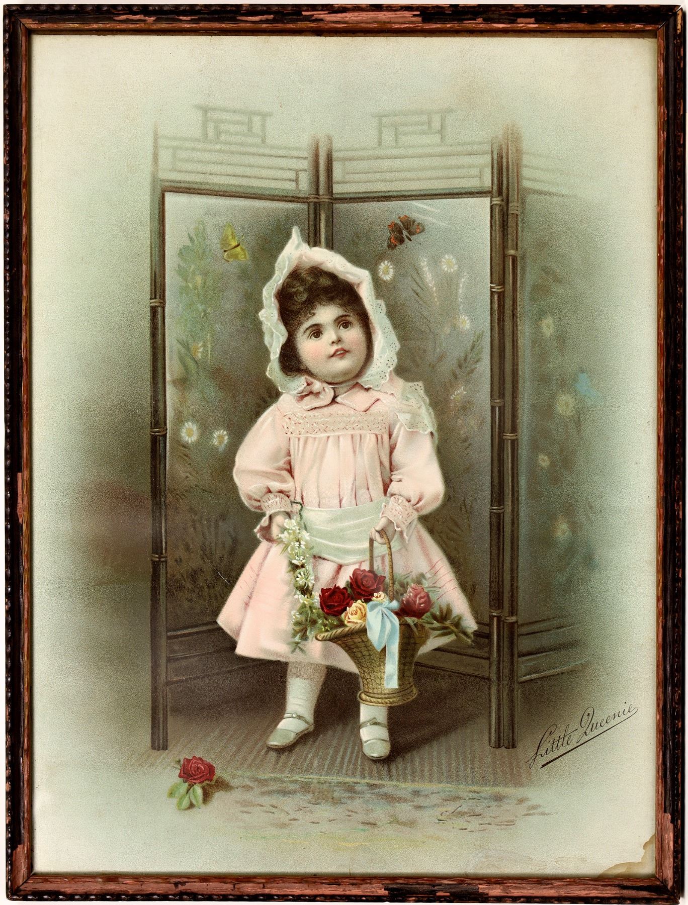 Very attractive chromolitho entitled "Little Queenie", framed, about 15 x 21 inches. No artist shown, small 1-inch water damage at lower right corner.